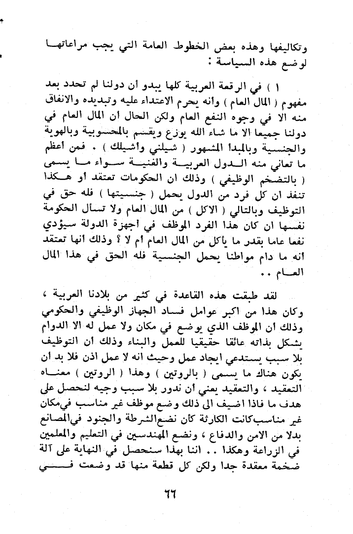 1- في الرقعة العربية كلها يبدو أن دولنا لم تحدد بعد مفهوم (المال العام) وأنه يحرم الاعتداء عليه وتبديده والأنفاق منه إلا في وجوه النفع العام ولكن الحال أن المال العام في دولنا جميعاً إلا ما شاء الله يوزع ويقسم بالمحسوبية وبالهوية والجنسية بالمبدأ المشهور (شيلني وأشيلك) ، فمن أعظم ما تعاني منه الدول العربية والغنية سواء ما يسمى (بالتضخم الوظيفي) وذلك أن الحكومات تعتقد أو هكذا تنفذ أن كل فرد من الدول يحمل (جنسيتها) فله حق في التوظيف وبالتالي (الأكل) من المال العام ولا تسأل الحكومة نفسها إن كان هذا الفرد الموظف في أجهزة الدولة سيؤدي نفعاً عاماً بقدر ما يأكل من المال العام أم لا؟ وذلك أنها تعتقد أنه مادام مواطناً يحمل الجنسية فله الحق في هذا المال العام.