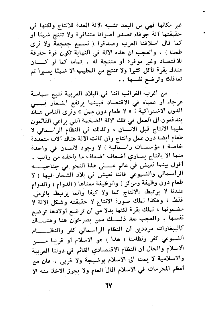 من أغرب الغرائب أننا في البلاد العربية نتبع سياسة عرجاء أو عمياء في الاقتصاد فبينما يرتفع الشعار في الدول الاشتراكية: "لا طعام دون عمل" ونرى الناس هناك يندفعون إلى العمل في تلك الآلة الضخمة التي يراعي القائمون عليها الإنتاج قبل الإنسان، وكذلك في النظام الرأسمالي لا طعام أيضاً دون عمل وإنتاج وإن كانت الآلة هناك آلات متعددة خاصة، (مؤسسات رأسمالية) لا وجود لإنسان في واحدة منها إلا بإنتاج يساوي أضعاف أضعاف ما يأخذه من راتب، أقول بينما نعيش في عالم على هذا النحو في جناحيه الرأسمالي والشيوعي فإننا نعيش في بلاد الشعار فيها (لا طعام دون وظيفة ومركز) ، والوظيفة معناها (الدوام) والدوام عندنا لا يرتبط بالإنتاج كماً ولا كيفاً، وإنما يرتبط بالزمن فقط، وهكذا نملك صورة الإنتاج لا حقيقته وشكل الآلة لا مضمونها، نملك بقرة لكنها بدلاً من أن تُرضع أولادها تُرضع نفسها، والعجب بعد ذلك ممن يصرخون هنا وهناك كالببغاوات مرددين أن النظام الرأسمالي كفر والنظام الشيوعي كفر، ونظامنا (هذا) هو الإسلام أو قريباً من الإسلام والحال أن النظام الاقتصادي القائم في دولنا العربية والإسلامية لا يمت إلى الإسلام بوشيجة ولا قربى، فإن من أعظم المحرمات في الإسلام المال العام ولا يجوز الأخذ منه إلا