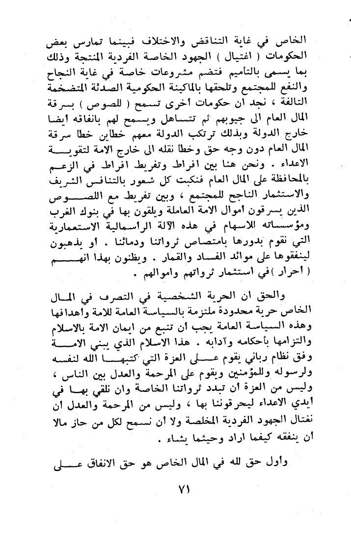 والحق أن الحرية الشخصية في التصرف في المال الخاص حرية محدودة ملتزمة بالسياسة العامة للأمة وأهدافها وهذه السياسة العامة يجب أن تنبع من إيمان الأمة بالإسلام والتزامها بأحكامه وآدابه، هذا الإسلام الذي يبني الأمة وفق نظام رباني يقوم على العزة التي كتبها الله لنفسه ولرسوله وللمؤمنين ويقوم على المرحمة والعدل بين الناس، وليس من العزة أن تبدد ثرواتنا الخاصة وأن نلقي بها في أيدي الأعداء ليحرقوننا بها، وليس من المرحمة والعدل أن نغتال الجهود الفردية المخلصة ولا أن نسمح لكل من حاز مالاً أن ينفقه كيفما أراد وحيثما يشاء.