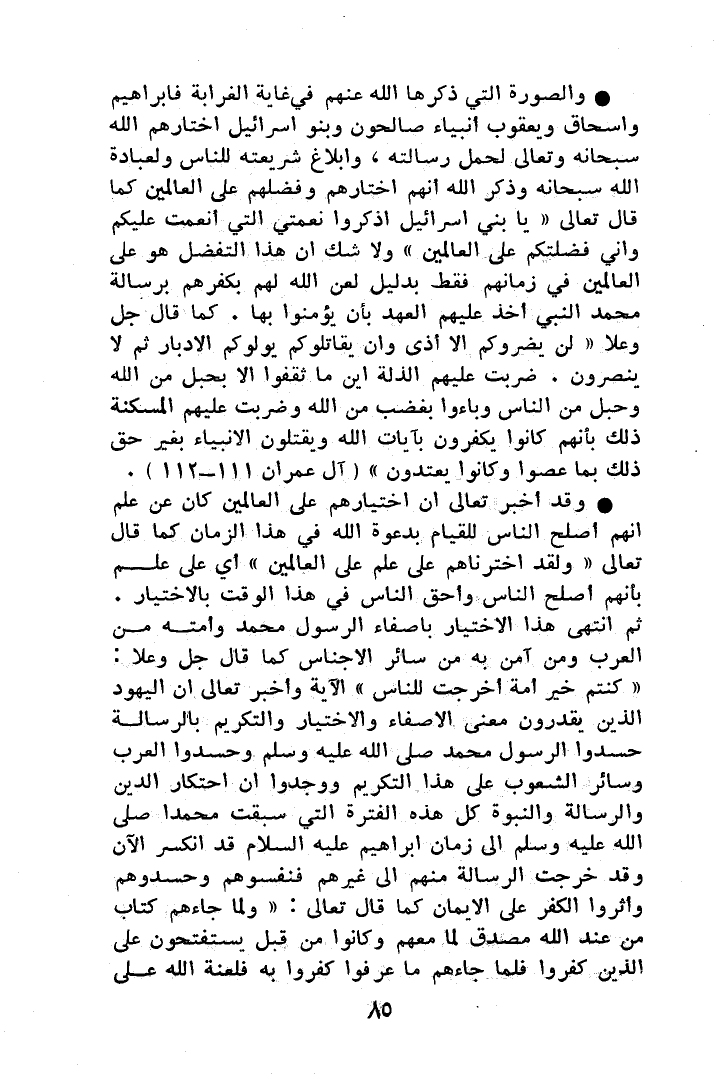 * والصورة التي ذكرها الله عنهم في غاية الغرابة فإبراهيم وإسحاق ويعقوب أنبياء صالحون وبنو إسرائيل اختارهم الله سبحانه وتعالى لحمل رسالته، وإبلاغ شريعته للناس ولعبادة الله سبحانه وذكر الله أنهم اختارهم وفضلهم على العالمين كما قال تعالى: {يا بني إسرائيل اذكروا نعمتي التي أنعمت عليكم وإني فضلتكم على العالمين} ولا شك أن هذا التفضل هو على العالمين في زمانهم فقط بدليل لعن الله لهم بكفرهم برسالة محمد النبي أخذ عليهم العهد بأن يؤمنوا بها، كما قال جل وعلا: {لن يضروكم إلا أذى وأن يقاتلوكم يولوكم الأدبار ثم لا ينصرون. ضربت عليهم الذلة أين ما ثقفوا إلا بحبل من الله وحبل من الناس وباءوا بغضب من الله وضربت عليهم المسكنة ذلك بأنهم كانوا يكفرون بآيات الله ويقتلون الأنبياء بغير حق ذلك بما عصوا وكانوا يعتدون} (آل عمران: 111-112) .
