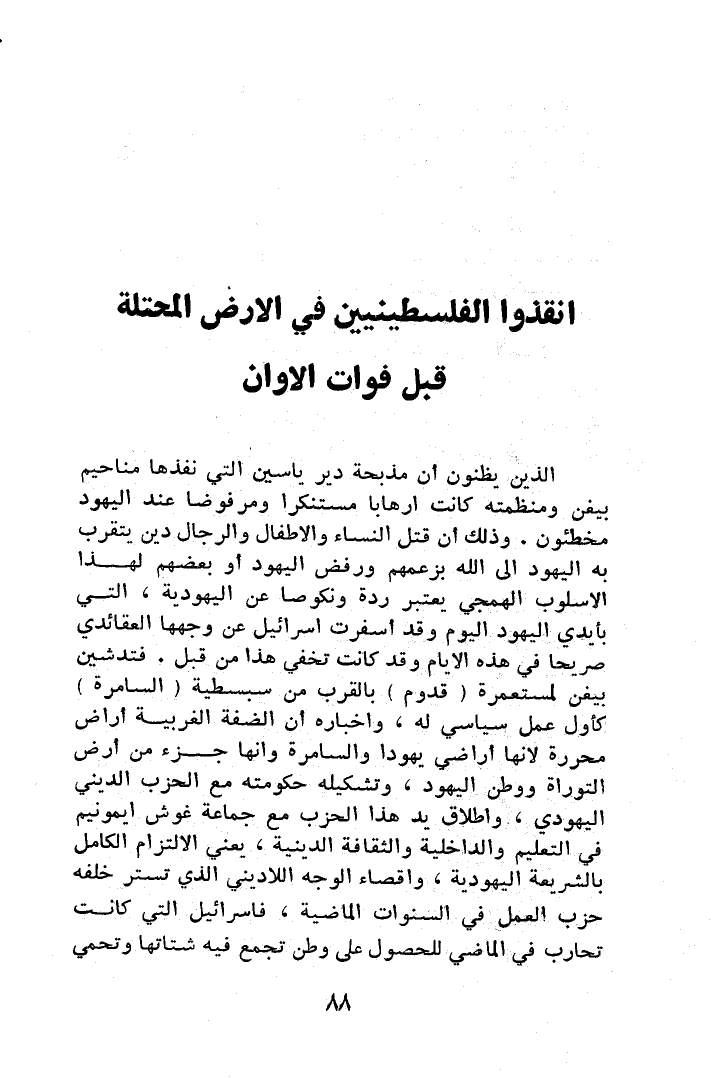 الذين يظنون أن مذبحة دير ياسين التي نفذها مناحيم بيغن ومنظمته كانت إرهاباً مستنكراً ومرفوضاً عند اليهود مخطئون، وذلك أن قتل النساء والأطفال والرجال دين يتقرب به اليهود إلى الله بزعمهم ورفض اليهود أو بعضهم لهذا الأسلوب الهمجي يعتبر ردة ونكوصاً عن اليهودية، التي بأيدي اليهود اليوم وقد أسفرت إسرائيل عن وجهها العقائدي صريحاً في هذه الأيام وقد كانت تخفي هذا من قبل، فتدشين بيغن لمستعمرة (قدوم) بالقرب من سبسطية (السامرة) كأول عمل سياسي له، وأخباره أن الضفة الغربية أراض محررة لأنها أراضي يهودا والسامرة وأنها جزء من أرض التوراة ووطن اليهود، وتشكيله حكومته مع الحزب الديني اليهودي، وإطلاق يد هذا الحزب مع جماعة غوش إيمونيم في التعليم والداخلية والثقافة الدينية، يعني الالتزام الكامل بالشريعة اليهودية، وإقصاء الوجه اللاديني الذي تستر خلقه حزب العمل في السنوات الماضية، فإسرائيل التي كانت تحارب في الماضي للحصول على وطن تجمع فيه شتاتها وتحمي