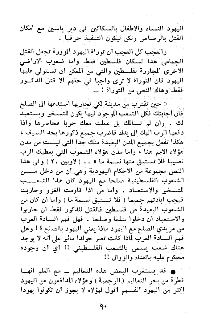 "وحين تقترب من مدينة لكي تحاربها استدعها إلى الصلح فإن أجابتك فكل الشعب الموجود فيها يكون للتسخير ويستعبد لك، وإن لم تسالمك بل عملت معك حرباً فحاصرها وإذا دفعها الرب إلهك إلى يدك فاضرب جميع ذكورها بحد السيف، هكذا تفعل بجميع المدن البعيدة منك جداً التي ليست من مدن هؤلاء الأمم هنا، وأما مدن هؤلاء الشعوب التي يعطيك الرب نصيباً فلا تستبق منها نسمة ما".. (لاويين 20) ، وفي هذا النص مجموعة من الأحكام اليهودية وهي أن من دخل من الشعوب الفلسطينية صلحاً مع اليهود كان هذا الشعب للتسخير والاستعباد، وأما من إذا قاومت الغزو وحاربت فيجب إبادتهم جميعاً (فلا تستبق نسمة ما) وأما إن كان من الشعوب البعيدة عن فلسطين فالقتل للذكور فقط إن حاربوا والاستعباد إن دخلوا سلماً وصلحاً. فهل فهم السادة العرب من مريدي الصلح مع اليهود ماذا يعني اليهود بالصلح؟! وهل فهم السادة العرب لماذا كانت تصر جولدا مائير على أنه لا يوجد هناك شعب يسمى بالشعب الفلسطيني!! أي أن وجوده محكم عليه بالفناء والزوال!!