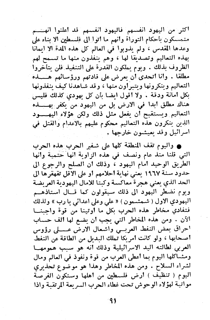 * واليوم تقف المنطقة كلها على شفير الحرب، هذه الحرب التي قلنا منذ عام ونصف في هذه الزاوية أنها حتمية وأنها الطريق الوحيد أمام اليهود، وذلك أن الصلح والرجوع إلى حدود 1967 يعني نهاية أحلامهم أو على الأقل تقهقرها إلى الحد الذي يعني هجرة معاكسة وكبتاً للآمال اليهودية العريضة ويوم نضطر اليهود إلى ذلك سيقولون كما قال أستاذهم اليهودي الأول (شمشون) "علي وعلى أعدائي يا رب" ولذلك فتفادي مخاطر هذه الحرب بكل ما أوتينا من قوة واجبنا الآن. ومن هذه المخاطر التي يجب أن يضع لها ألف حساب إحراق بعض النفط العربي وإشعال الأرض على رؤوس أصحابها، ولو كانت أمريكا تملك البديل من الطاقة عن النفط العربي لطالته اليد الإسرائيلية وذلك أنه هو سبب همومها ومشاكلها اليوم بما أعطى العرب من قوة ونفوذ في العالم ومال لشراء السلاح. ومن هذه المخاطر وهذا هو موضوع تحذيري اليوم (تنظيف) أرض فلسطين من أهلها وستكون الفرصة مواتية لهؤلاء الوحوش تحت غطاء الحرب السريعة المرتقبة وإذا