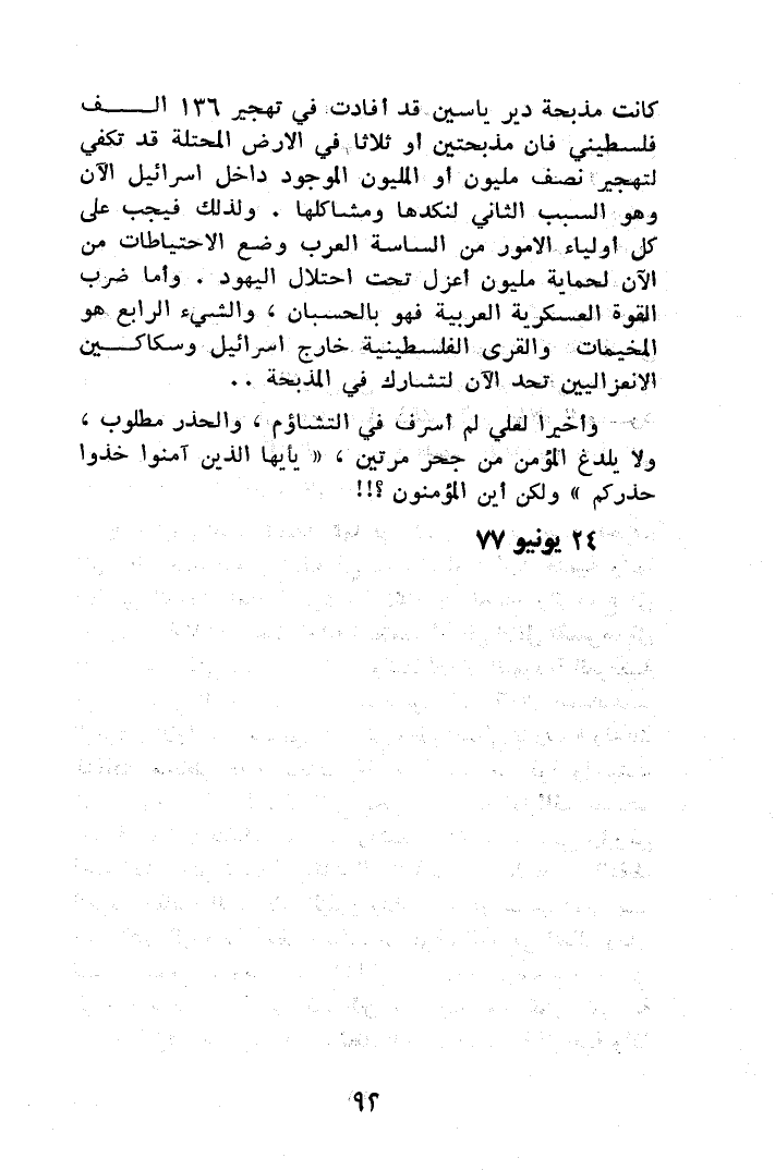 كانت مذبحة دير ياسين قد أفادت في تهجير 136 ألف فلسطيني فإن مذبحتين أو ثلاثاً في الأرض المحتلة قد تكفي لتهجير نصف مليون أو المليون الموجود داخل إسرائيل الآن وهو السبب الثاني لنكدها ومشاكلها. ولذلك فيجب على كل أولياء الأمور من الساسة العرب وضع الاحتياطات من الآن لحماية مليون أعزل تحت احتلال اليهود. وأما ضرب القوة العسكرية العربية فهو بالحسبان، والشيء الرابع هو المخيمات والقرى الفلسطينية خارج إسرائيل وسكاكين الانعزاليين تحد الآن لتشارك في المذبحة..