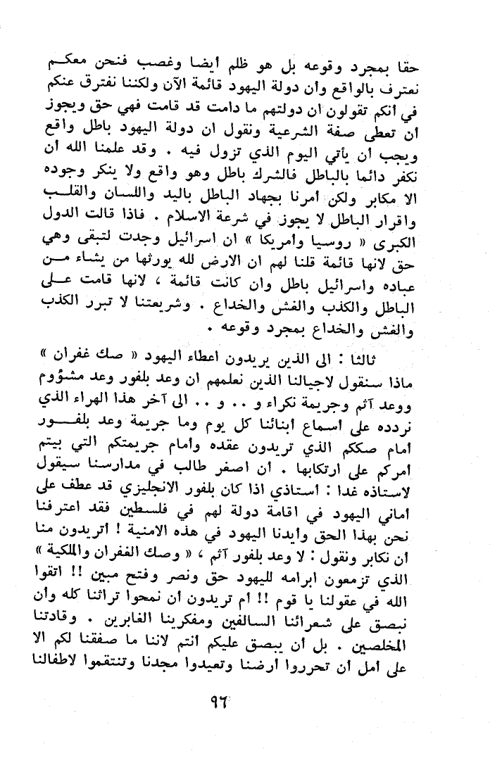 ثالثاً: إلى الذين يريدون إعطاء اليهود "صك غفران" ماذا سنقول لأجيالنا الذين نعلمهم أن وعد بلفور وعد مشؤوم ووعد آثم وجريمة نكراء و.. و.. إلى آخر هذا الهراء الذي نردده في أسماع أبنائنا كل يوم وما جريمة وعد بلفور أمام صككم الذي تريدون عقده وأمام جريمتكم التي بيتم أمركم على ارتكابها، إن أصغر طالب في مدارسنا سيقول لأستاذه غداً: أستاذي إذا كان بلفور الإنجليزي قد عطف على أماني اليهود في إقامة دولة لهم في فلسطين فقد اعترفنا نحن بهذا الحق وأيدنا اليهود في هذه الأمنية! أتريدون منا أن نكابر ونقول: لا وعد بلفور آثم، "وصك الغفران والملكية" الذي تزمعون إبرامه لليهود حق ونصر وفتح مبين!! اتقوا الله في عقولنا يا قوم!! أم تريدون أن نمحوا تراثناً كله وأن نبصق على شعرائنا السالفين ومفكرينا الغابرين، وقادتنا المخلصين، بل أن يبصق عليكم أنتم لأننا ما صفقنا لكم إلا على أمل أن تحرروا أرضنا وتعيدوا مجدنا وتنقموا لأطفالنا