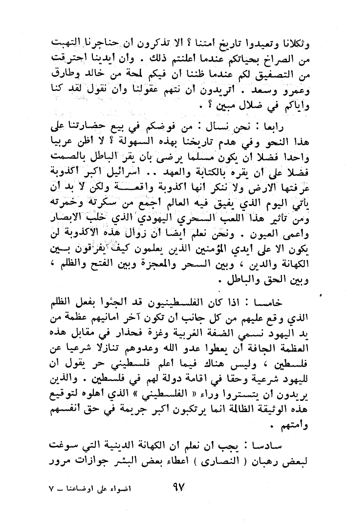 رابعاً: نحن نسأل: من فوضكم في بيع حضارتنا على هذا النحو وفي هدم تاريخنا بهذه السهولة؟ لا أظن عربياً واحداً فضلاً عن أن يكون مسلماً يرضى بأن يقر الباطل بالصمت فضلاً على أن يقره بالكتابة والعهد.. إسرائيل أكبر أكذوبة عرفتها لأرض ولا ننكر أنها أكذوبة واقعة ولكن لابد أن يأتي اليوم الذي يفيق فيه العالم أجمع من سكرته وخمرته ومن تأثير هذا اللعب السحري اليهودي الذي خلب الأبصار وأعمى العيون، ونحن نعلم أيضاً أن زوال هذه الأكذوبة لن يكون إلا على أيدي المؤمنين الذين يعملون كيف يفرقون بين الكهانة والدين، وبين السحر والمعجزة وبين الفتح والظلم، وبين الحق والباطل.