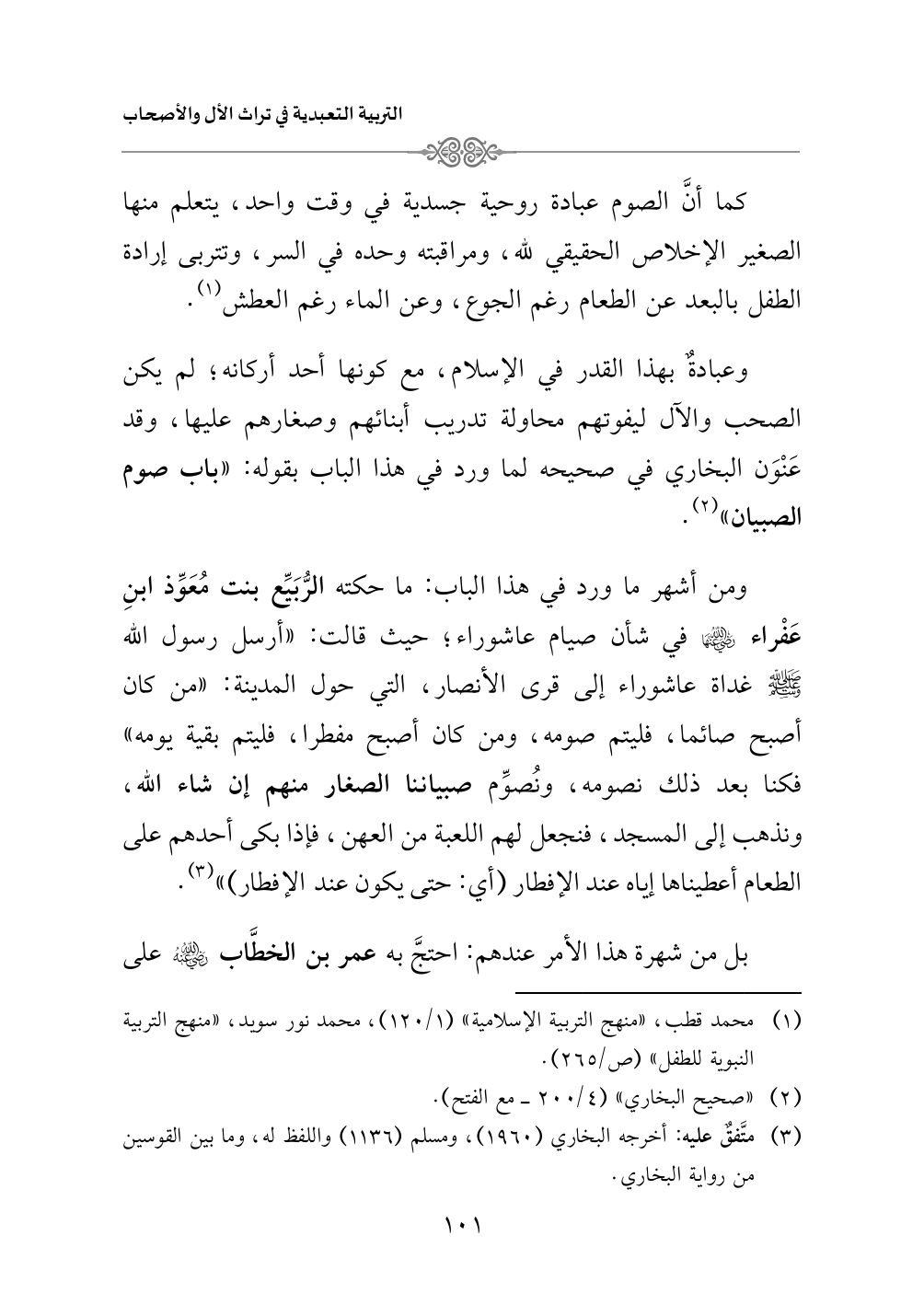 وعبادةٌ بهذا القدر في الإسلام، مع كونها أحد أركانه؛ لم يكن الصحب والآل ليفوتهم محاولة تدريب أبنائهم وصغارهم عليها، وقد عَنْوَن البخاري في صحيحه لما ورد في هذا الباب بقوله: "باب صوم الصبيان" (¬٢).