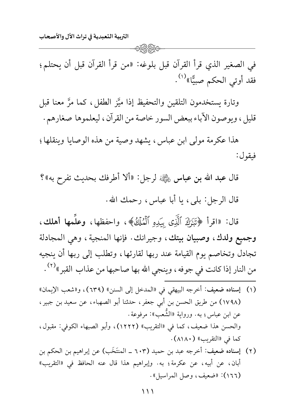 وتارة يستخدمون التلقين والتحفيظ إذا ميَّز الطفل، كما مرَّ معنا قبل قليل، ويوصون الآباء ببعض السور خاصة من القرآن، ليعلموها صغارهم.