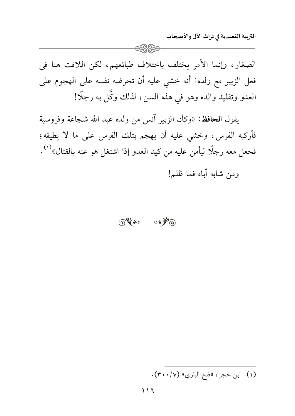 الصغار، وإنما الأمر يختلف باختلاف طبائعهم، لكن الملفت هنا في فعل الزبير مع ولده: أنه خشي عليه أن تحرضه نفسه على الهجوم على العدو وتقليد والده وهو في هذه السن؛ لذلك وكَّل به رجلًا!