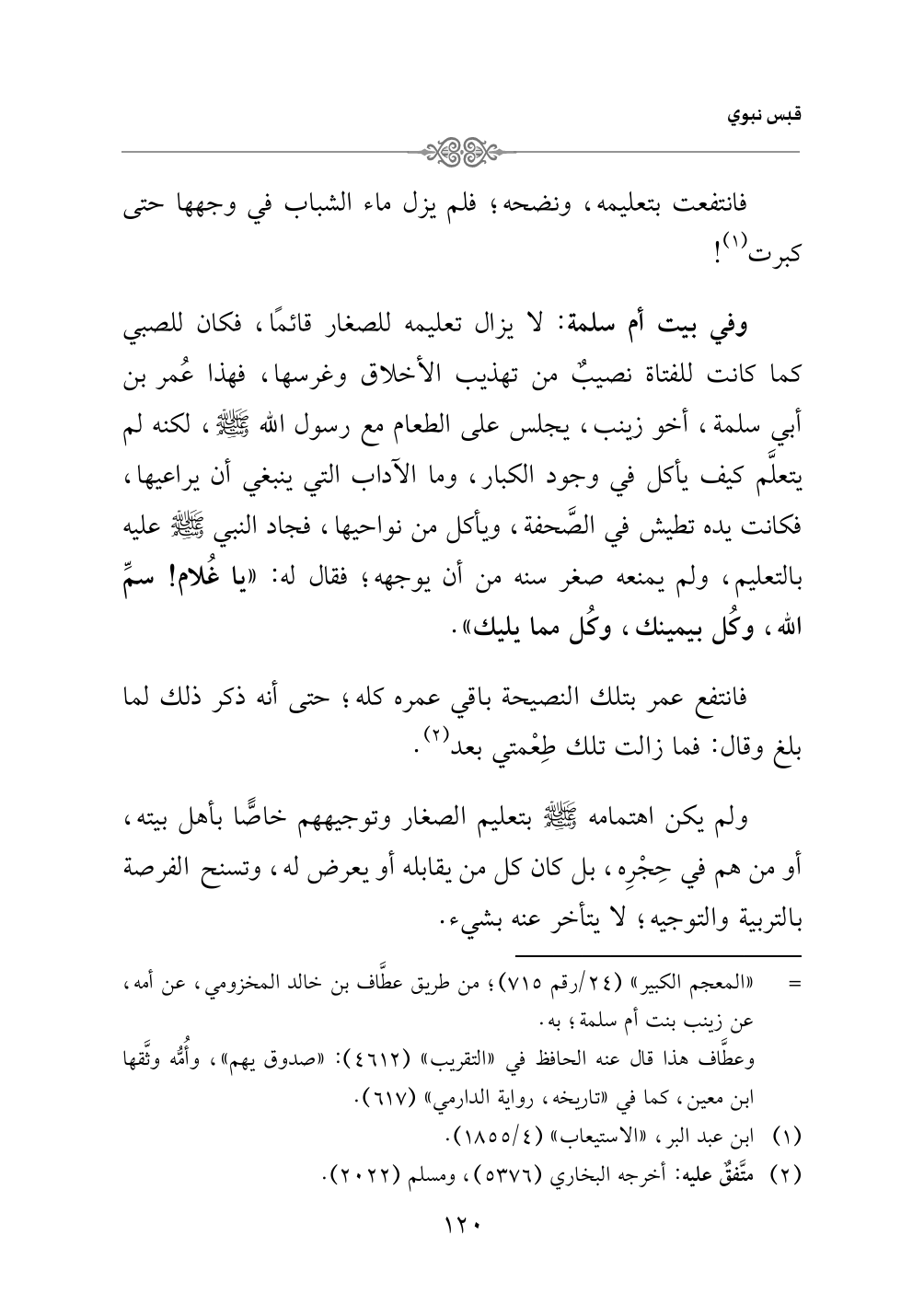 وفي بيت أم سلمة: لا يزال تعليمه للصغار قائمًا، فكان للصبي كما كانت للفتاة نصيبٌ من تهذيب الأخلاق وغرسها، فهذا عُمر بن أبي سلمة، أخو زينب، يجلس على الطعام مع رسول الله - صلى الله عليه وسلم -، لكنه لم يتعلَّم كيف يأكل في وجود الكبار، وما الآداب التي ينبغي أن يراعيها، فكانت يده تطيش في الصَّحفة، ويأكل من نواحيها، فجاد النبي - صلى الله عليه وسلم - عليه بالتعليم، ولم يمنعه صغر سنه من أن يوجهه؛ فقال له: «يا غُلام! سمِّ الله، وكُل بيمينك، وكُل مما يليك».
