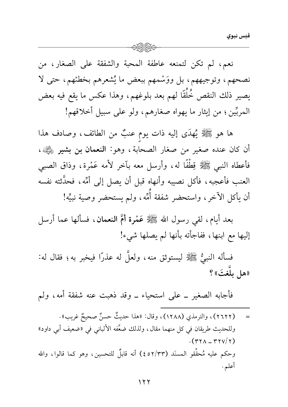 ها هو - صلى الله عليه وسلم - يُهدَى إليه ذات يومٍ عنبٌ من الطائف، وصادف هذا أن كان عنده صغير من صغار الصحابة، وهو: النعمان بن بشير - رضي الله عنه -، فأعطاه النبي - صلى الله عليه وسلم - قِطْفًا له، وأرسل معه بآخر لأمه عَمْرة، وذاق الصبي العنب فأعجبه، فأكل نصيبه وأنهاه قبل أن يصل إلى أمِّه، فحدَّثته نفسه أن يأكل الآخر، واستحضر شفقة أُمِّه، ولم يستحضر وصية نبيِّه!