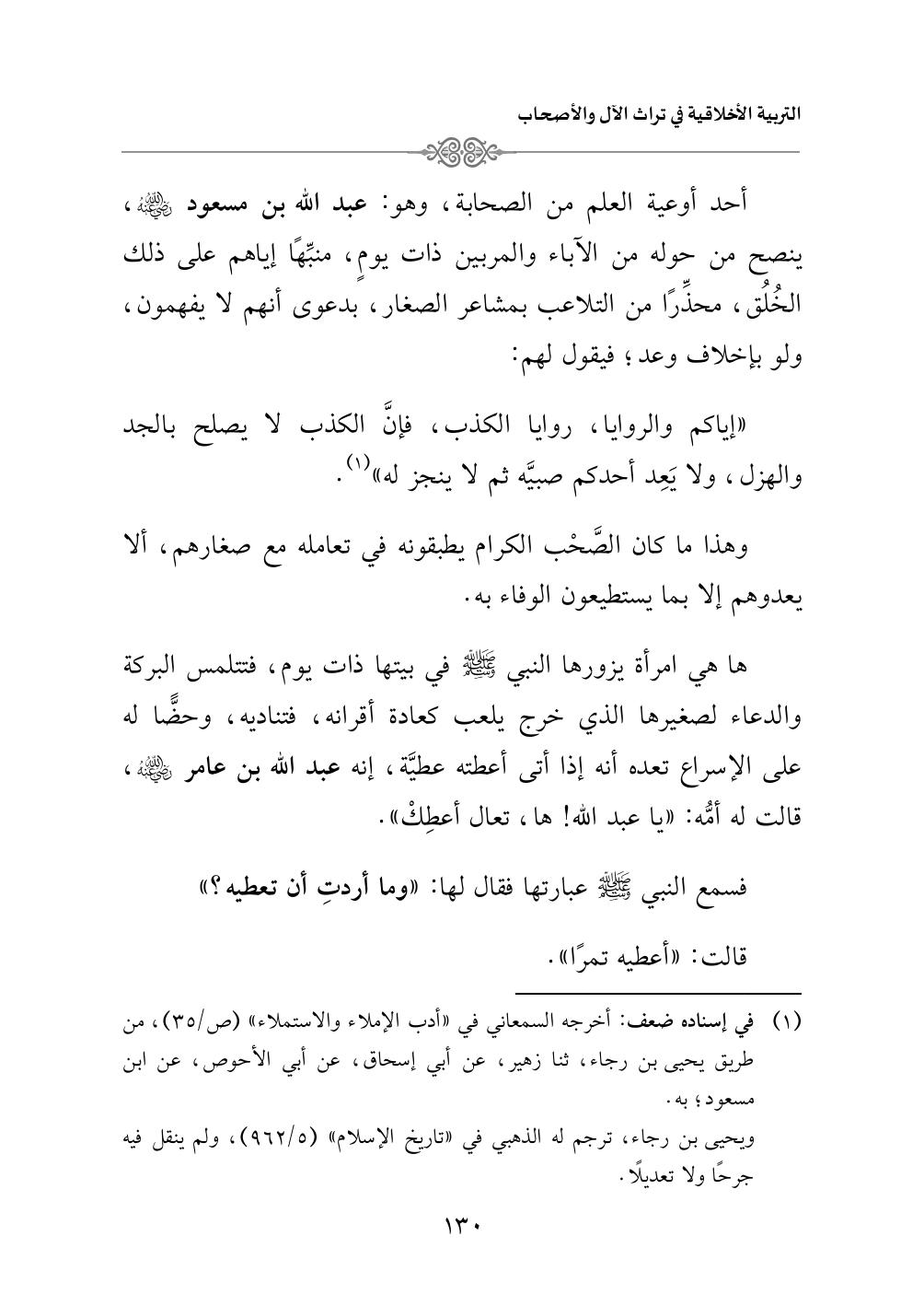 أحد أوعية العلم من الصحابة، وهو: عبدالله بن مسعود - رضي الله عنه -، ينصح من حوله من الآباء والمربين ذات يومٍ، منبِّهًا إياهم على ذلك الخُلُق، محذِّرًا من التلاعب بمشاعر الصغار، بدعوى أنهم لا يفهمون، ولو بإخلاف وعد؛ فيقول لهم: