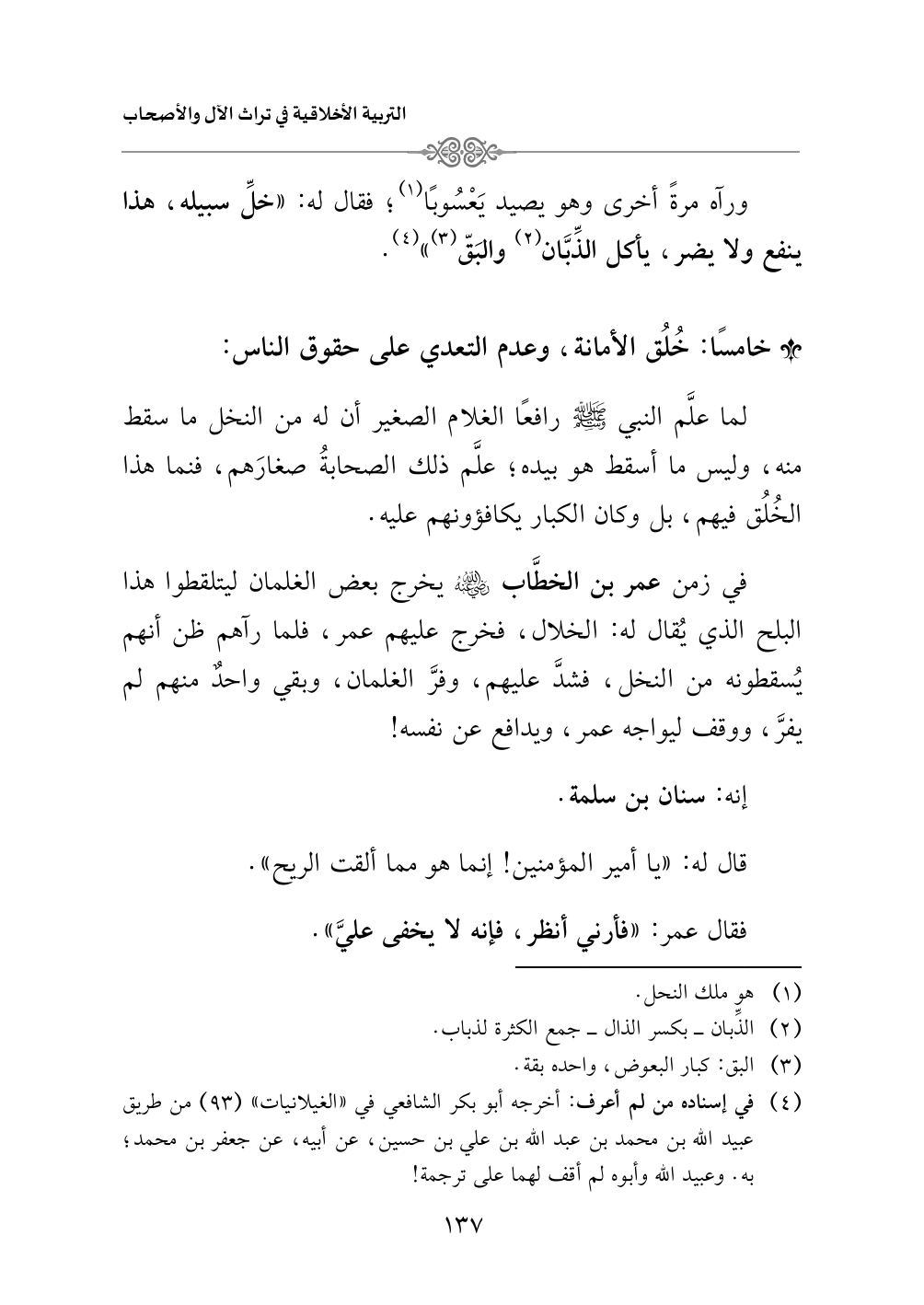 لما علَّم النبي - صلى الله عليه وسلم - رافعًا الغلام الصغير أن له من النخل ما سقط منه، وليس ما أسقط هو بيده؛ علَّم ذلك الصحابةُ صغارَهم، فنما هذا الخُلُق فيهم، بل وكان الكبار يكافؤونهم عليه.