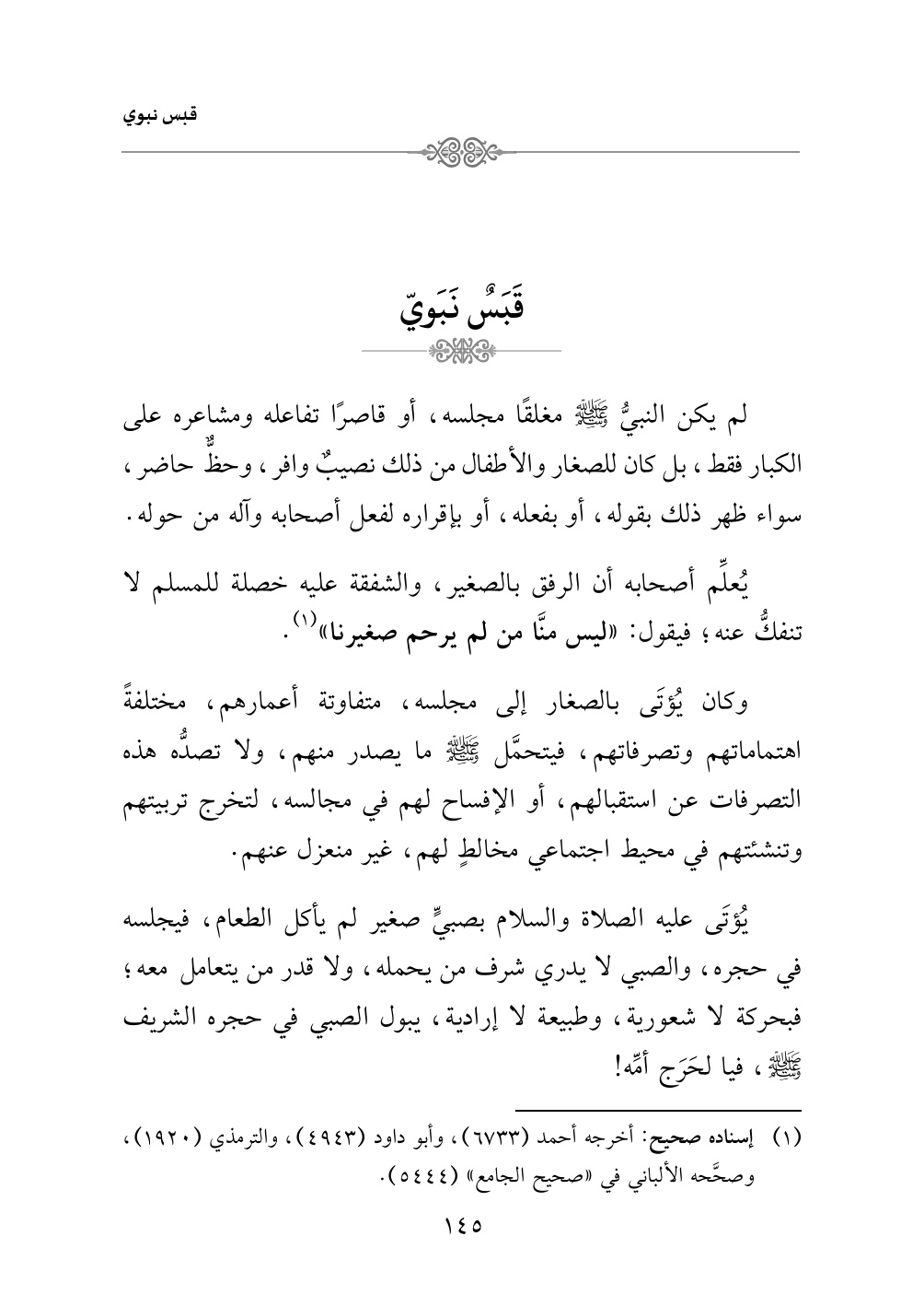 يُعلِّم أصحابه أن الرفق بالصغير، والشفقة عليه خصلة للمسلم لا تنفكُّ عنه؛ فيقول: «ليس منَّا من لم يرحم صغيرنا» (¬١).