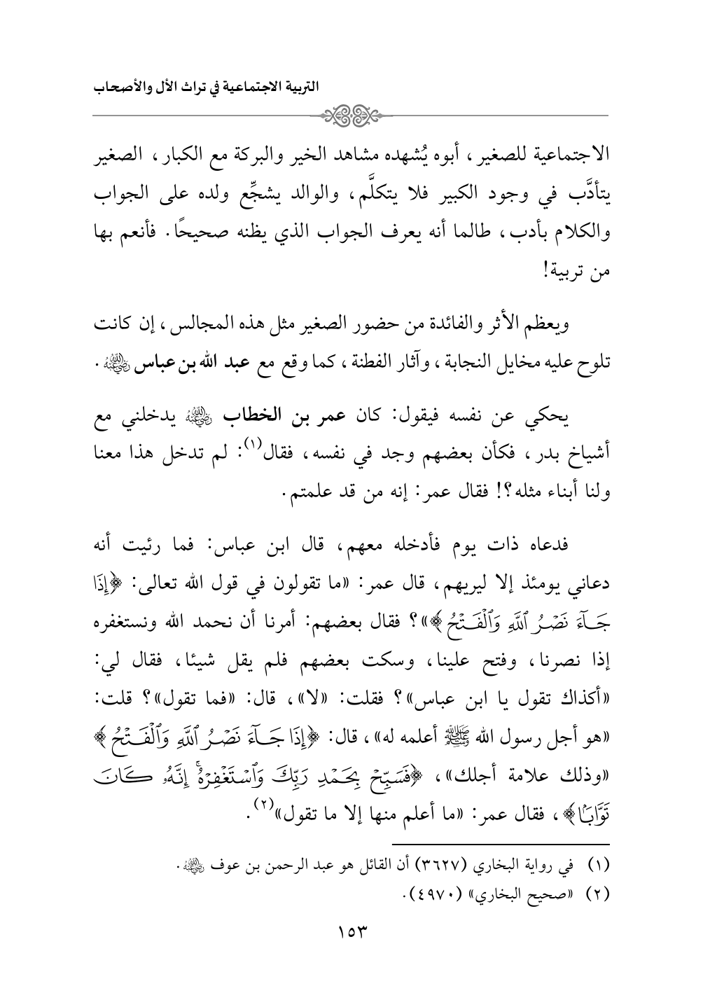 الاجتماعية للصغير، أبوه يُشهده مشاهد الخير والبركة مع الكبار، الصغير يتأدَّب في وجود الكبير فلا يتكلَّم، والوالد يشجِّع ولده على الجواب والكلام بأدب، طالما أنه يعرف الجواب الذي يظنه صحيحًا. فأنعم بها من تربية!