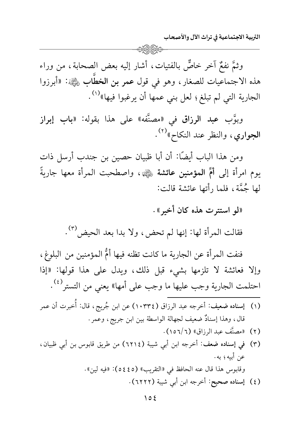 وثمَّ نفعٌ آخر خاصٌّ بالفتيات، أشار إليه بعض الصحابة، من وراء هذه الاجتماعيات للصغار، وهو في قول عمر بن الخطَّاب - رضي الله عنه -: ««أبرزوا الجارية التي لم تبلغ؛ لعل بني عمها أن يرغبوا فيها» (¬١).