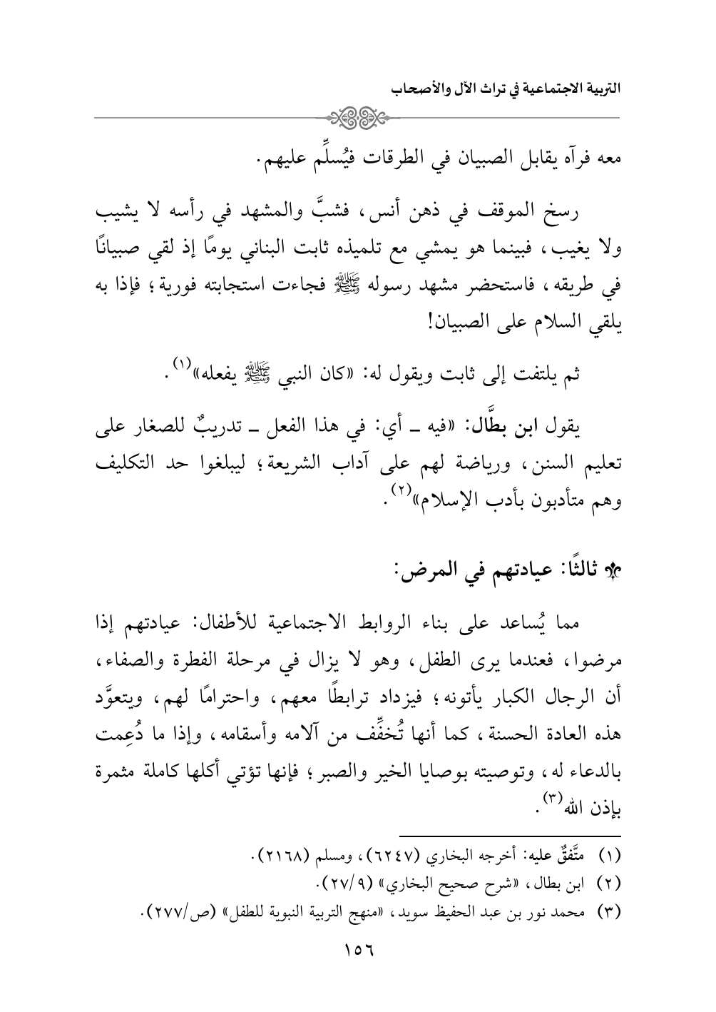 مما يُساعد على بناء الروابط الاجتماعية للأطفال: عيادتهم إذا مرضوا، فعندما يرى الطفل، وهو لا يزال في مرحلة الفطرة والصفاء، أن الرجال الكبار يأتونه؛ فيزداد ترابطًا معهم، واحترامًا لهم، ويتعوَّد هذه العادة الحسنة، كما أنها تُخفِّف من آلامه وأسقامه، وإذا ما دُعِمت بالدعاء له، وتوصيته بوصايا الخير والصبر؛ فإنها تؤتي أكلها كاملة مثمرة بإذن الله (¬٣).