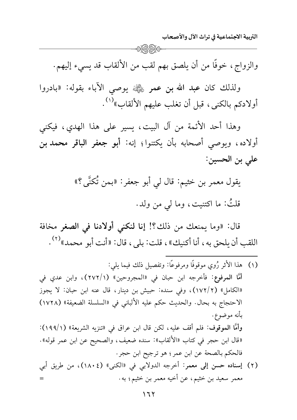 ولذلك كان عبدالله بن عمر - رضي الله عنه - يوصي الآباء بقوله: «بادروا أولادكم بالكنى، قبل أن تغلب عليهم الألقاب» (¬١).