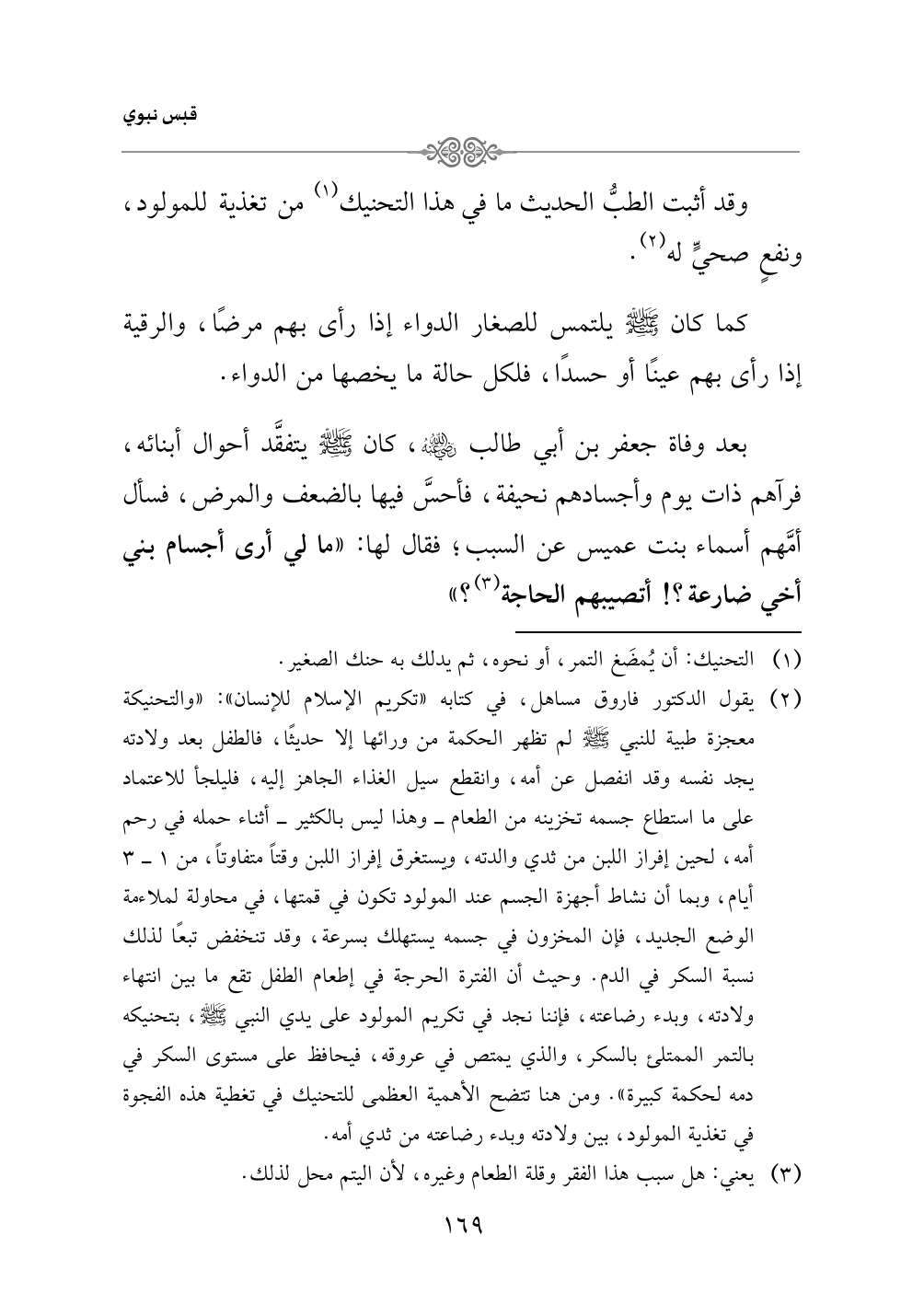 وقد أثبت الطبُّ الحديث ما في هذا التحنيك (¬١) من تغذية للمولود، ونفعٍ صحيٍّ له (¬٢).