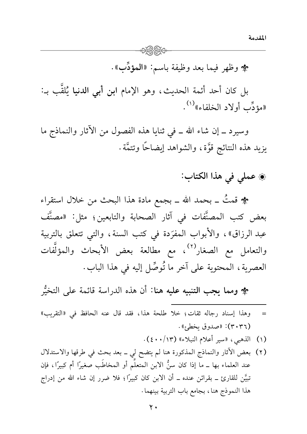 بل كان أحد أئمة الحديث، وهو الإمام ابن أبي الدنيا يُلقَّب بـ: "مؤدِّب أولاد الخلفاء" (¬١).