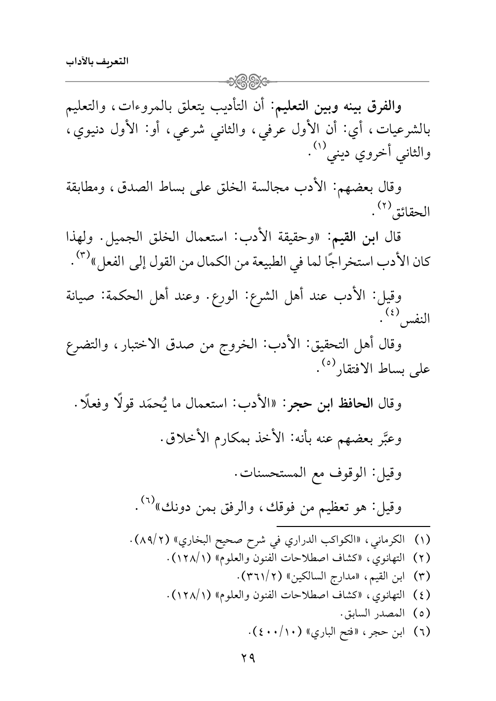 قال ابن القيم: "وحقيقة الأدب: استعمال الخلق الجميل. ولهذا كان الأدب استخراجًا لما في الطبيعة من الكمال من القول إلى الفعل" (¬٣).