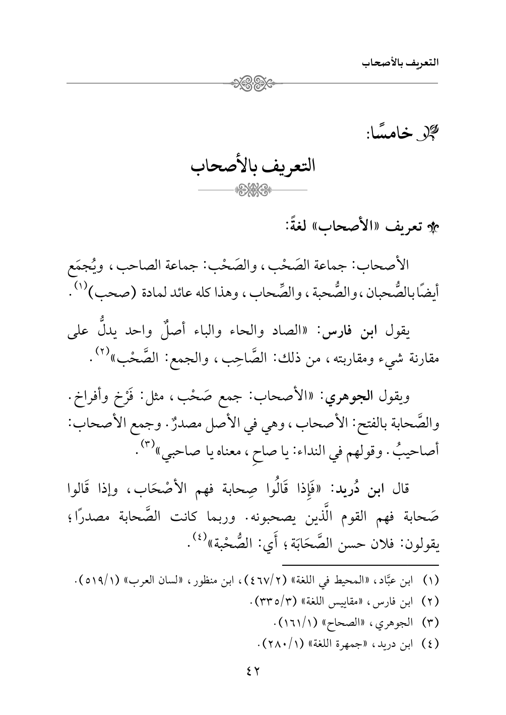 ويقول الجوهري: "الأصحاب: جمع صَحْب، مثل: فَرْخ وأفراخ. والصَّحابة بالفتح: الأصحاب، وهي في الأصل مصدرٌ. وجمع الأصحاب: أصاحيبُ. وقولهم في النداء: يا صاحِ، معناه يا صاحبي" (¬٣).