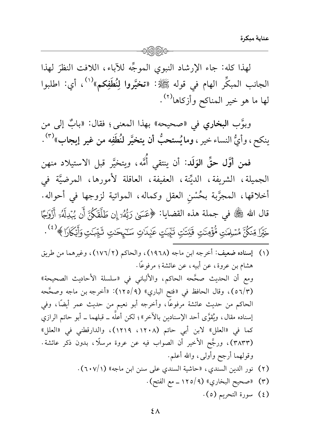لهذا كله: جاء الإرشاد النبوي الموجِّه للآباء، المُلفت النظرَ لهذا الجانب المبكِّر الهام في قوله - صلى الله عليه وسلم -: «تخيَّروا لِنُطَفِكم» (¬١)،