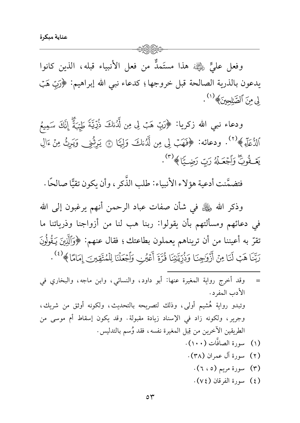 وفعل عليٍّ - رضي الله عنه - هذا مستَمدٌّ من فعل الأنبياء قبله، الذين كانوا يدعون بالذرية الصالحة قبل خروجها؛ كدعاء نبي الله إبراهيم: {رَبِّ هَبْ لِي مِنَ الصَّالِحِينَ} (¬١).