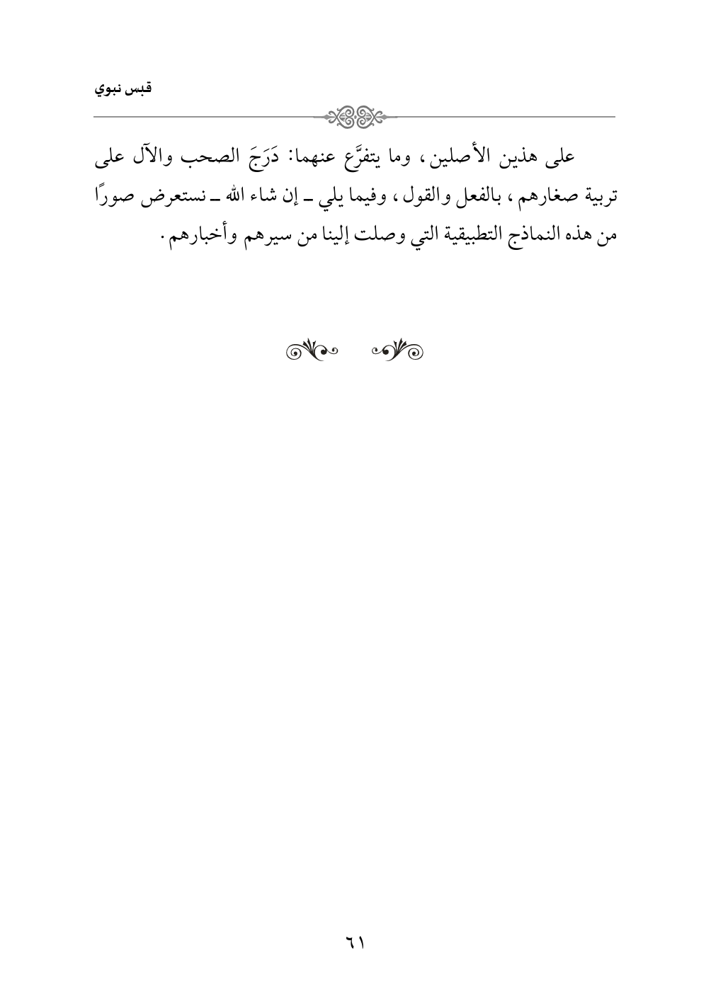 على هذين الأصلين، وما يتفرَّع عنهما: دَرَجَ الصحب والآل على تربية صغارهم، بالفعل والقول، وفيما يلي -إن شاء الله- نستعرض صورًا من هذه النماذج التطبيقية التي وصلت إلينا من سيرهم وأخبارهم.