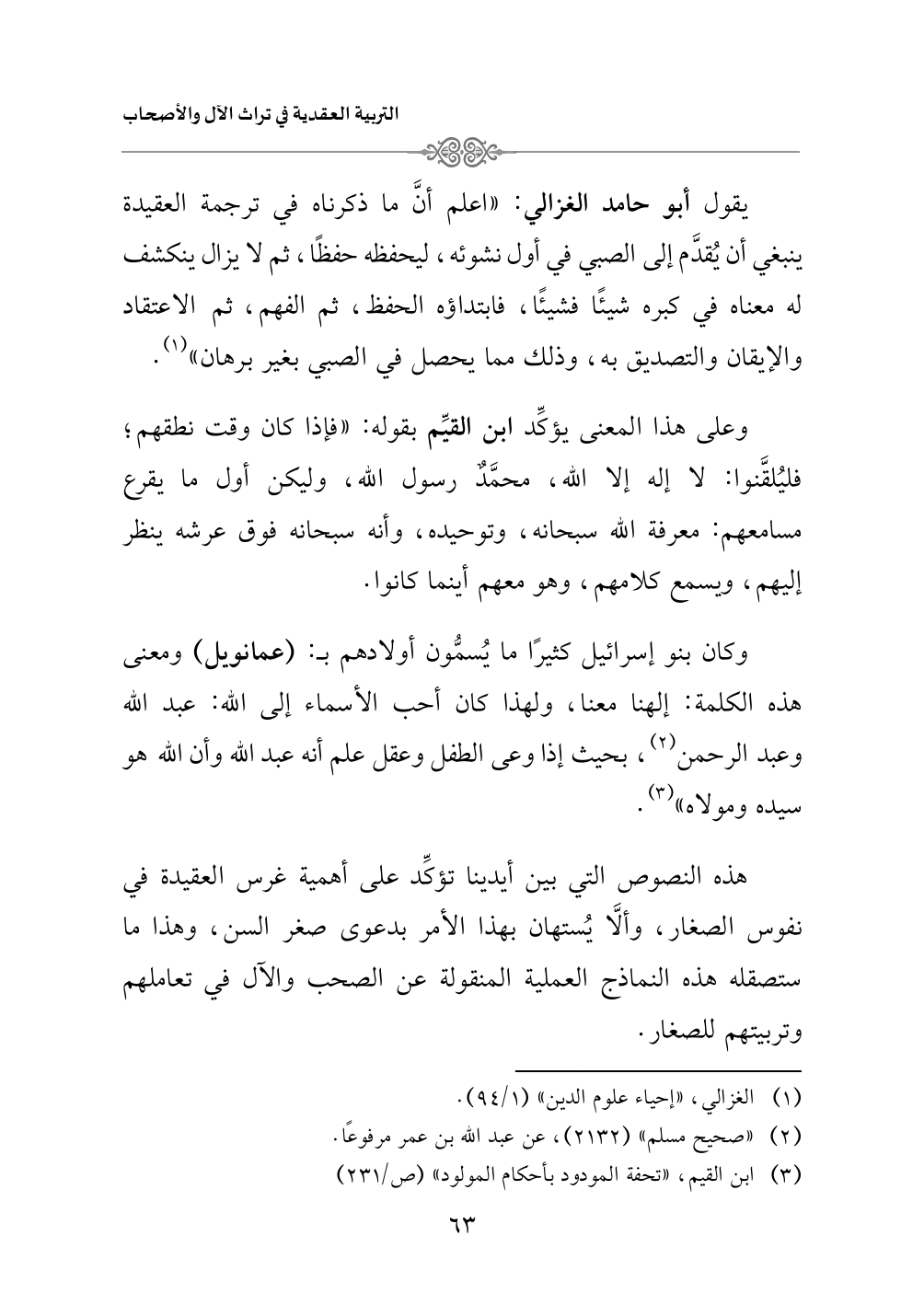 يقول أبو حامد الغزالي: "اعلم أنَّ ما ذكرناه في ترجمة العقيدة ينبغي أن يُقدَّم إلى الصبي في أول نشوئه، ليحفظه حفظًا، ثم لا يزال ينكشف له معناه في كبره شيئًا فشيئًا، فابتداؤه الحفظ، ثم الفهم، ثم الاعتقاد والإيقان والتصديق به، وذلك مما يحصل في الصبي بغير برهان" (¬١).