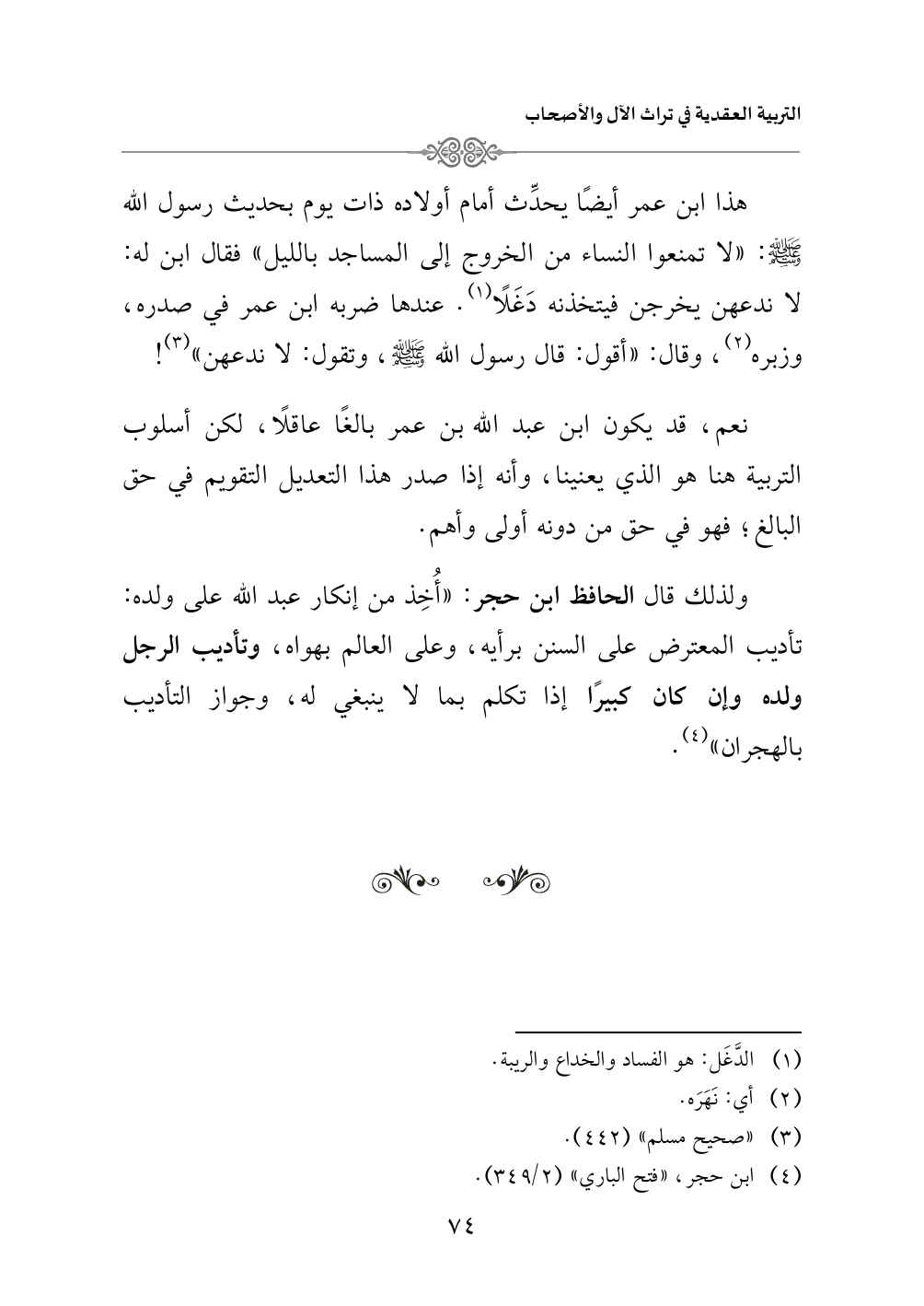 هذا ابن عمر أيضًا يحدِّث أمام أولاده ذات يوم بحديث رسول الله - صلى الله عليه وسلم -: «لا تمنعوا النساء من الخروج إلى المساجد بالليل» فقال ابن له: لا ندعهن يخرجن فيتخذنه دَغَلًا (¬١). عندها ضربه ابن عمر في صدره، وزبره (¬٢)، وقال: " أقول: قال رسول الله - صلى الله عليه وسلم -، وتقول: لا ندعهن (¬٣)!