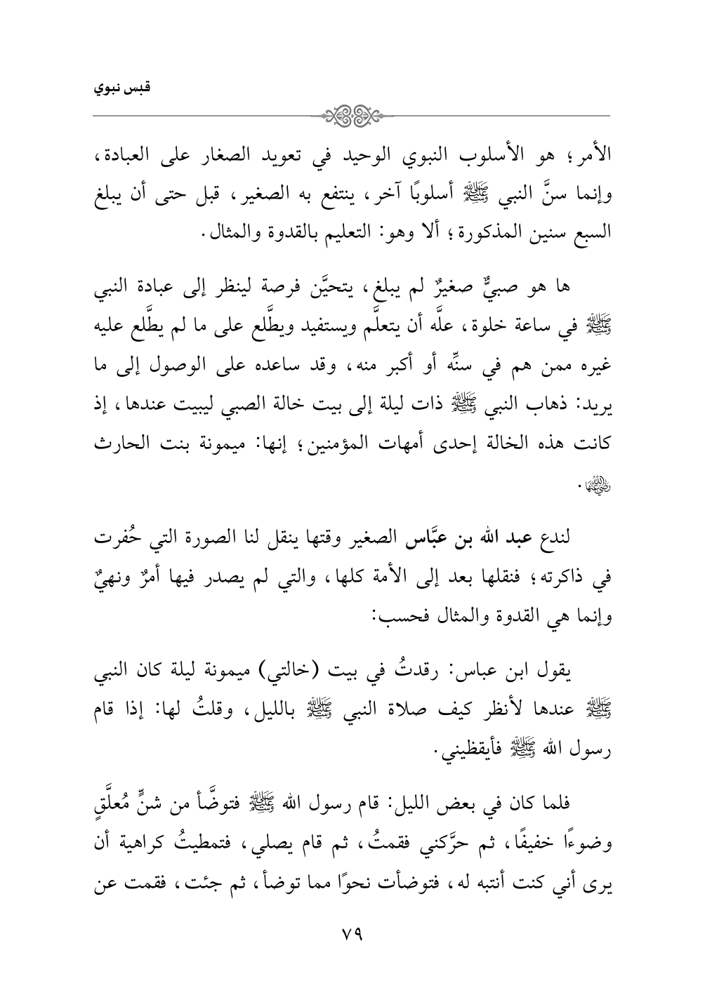 يقول ابن عباس: رقدتُ في بيت (خالتي) ميمونة ليلة كان النبي - صلى الله عليه وسلم - عندها لأنظر كيف صلاة النبي - صلى الله عليه وسلم - بالليل، وقلتُ لها: إذا قام رسول الله - صلى الله عليه وسلم - فأيقظيني.