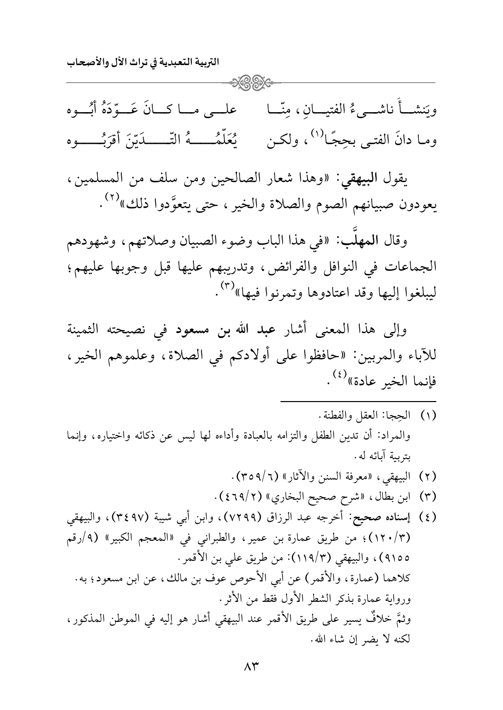 يقول البيهقي: "وهذا شعار الصالحين ومن سلف من المسلمين، يعودون صبيانهم الصوم والصلاة والخير، حتى يتعوَّدوا ذلك" (¬٢).