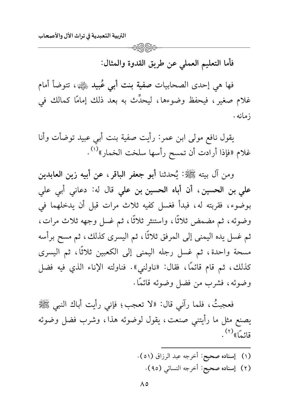 فها هي إحدى الصحابيات صفية بنت أبي عُبيد رضي الله عنها، تتوضأ أمام غلام صغير، فيحفظ وضوءها، ليحدِّث به بعد ذلك إمامًا كمالك في زمانه.