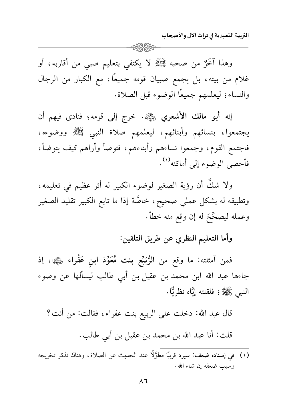 فمن أمثلته: ما وقع من الرُّبَيِّع بنت مُعَوِّذ ابنِ عَفْراء رضي الله عنها، إذ جاءها عبدالله ابن محمد بن عقيل بن أبي طالب ليسألها عن وضوء النبي - صلى الله عليه وسلم -؛ فلقنته إيَّاه نظريًّا.
