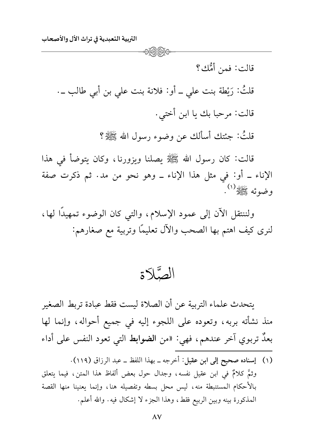 ولننتقل الآن إلى عمود الإسلام، والتي كان الوضوء تمهيدًا لها، لنرى كيف اهتم بها الصحب والآل تعليمًا وتربية مع صغارهم: