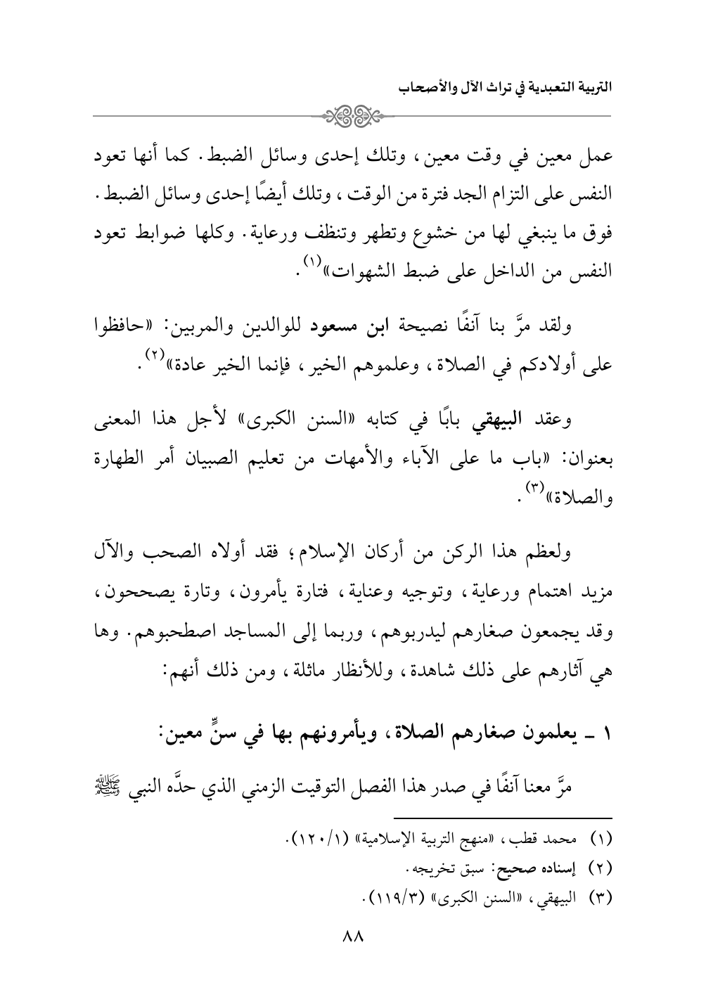 وعقد البيهقي بابًا في كتابه «السنن الكبرى» لأجل هذا المعنى بعنوان: "باب ما على الآباء والأمهات من تعليم الصبيان أمر الطهارة والصلاة" (¬٣).