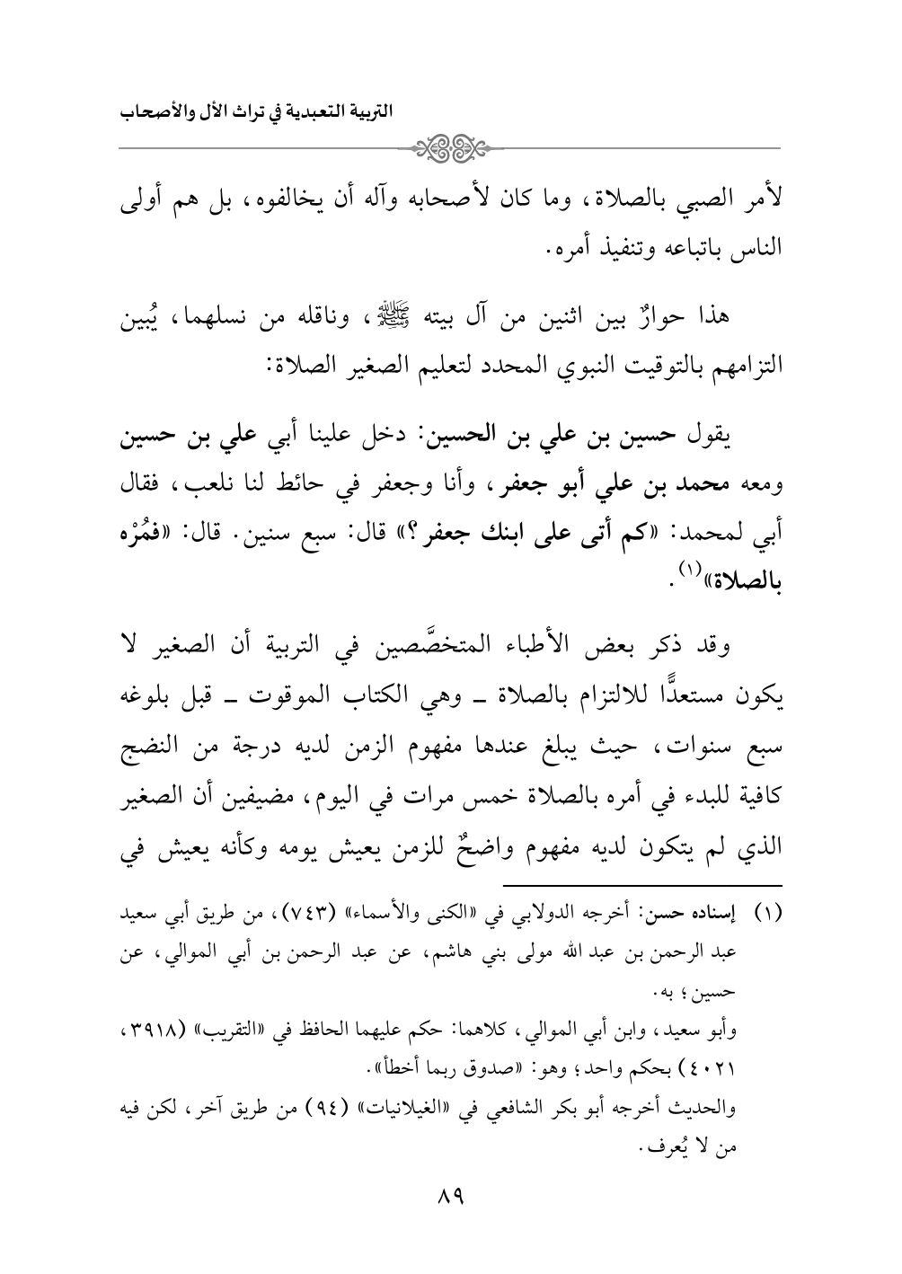 هذا حوارٌ بين اثنين من آل بيته - صلى الله عليه وسلم -، وناقله من نسلهما، يُبين التزامهم بالتوقيت النبوي المحدد لتعليم الصغير الصلاة: