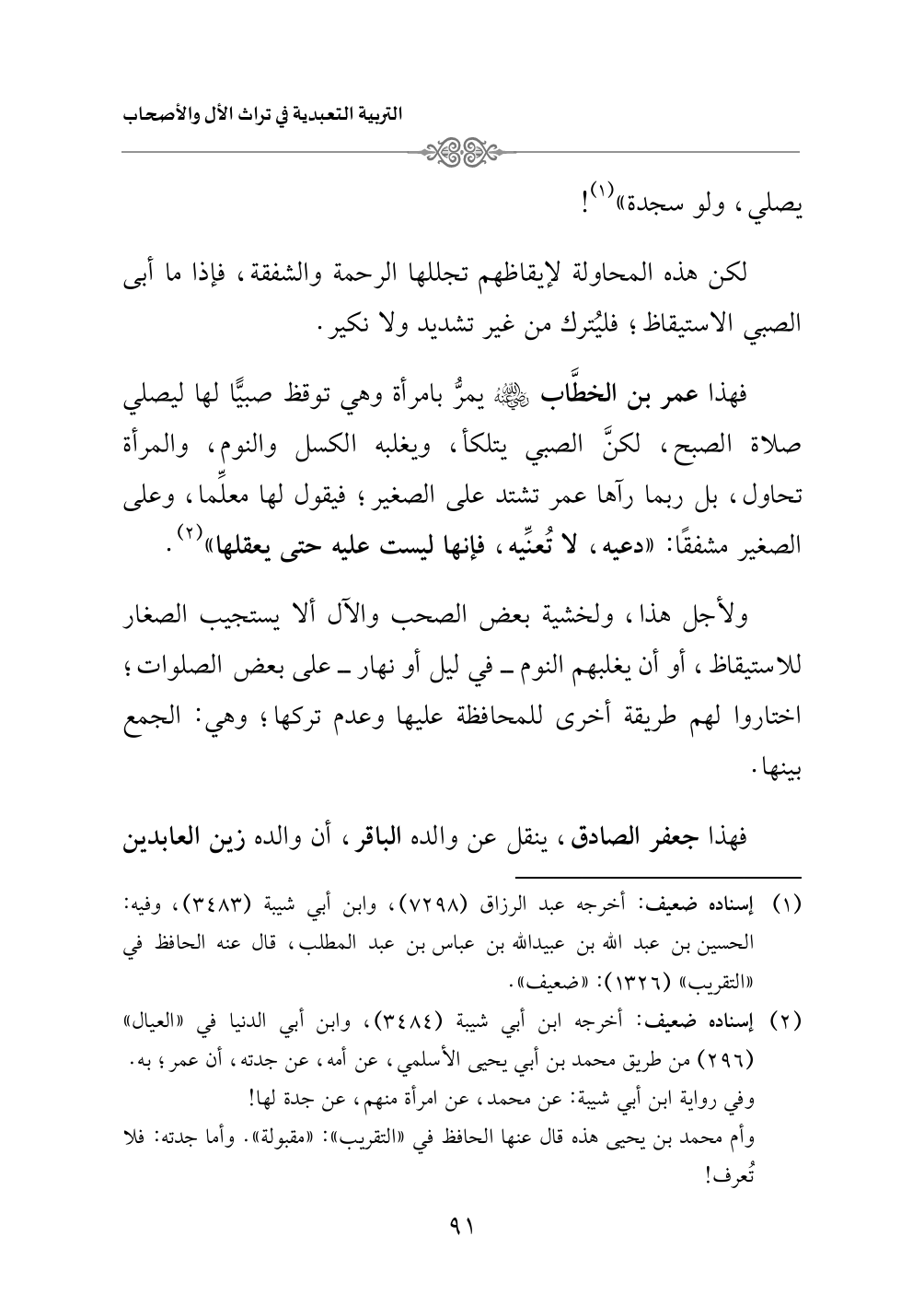 فهذا عمر بن الخطَّاب - رضي الله عنه - يمرُّ بامرأة وهي توقظ صبيًّا لها ليصلي صلاة الصبح، لكنَّ الصبي يتلكأ، ويغلبه الكسل والنوم، والمرأة تحاول، بل ربما رآها عمر تشتد على الصغير؛ فيقول لها معلِّما، وعلى الصغير مشفقًا: «دعيه، لا تُعنِّيه، فإنها ليست عليه حتى يعقلها» (¬٢).