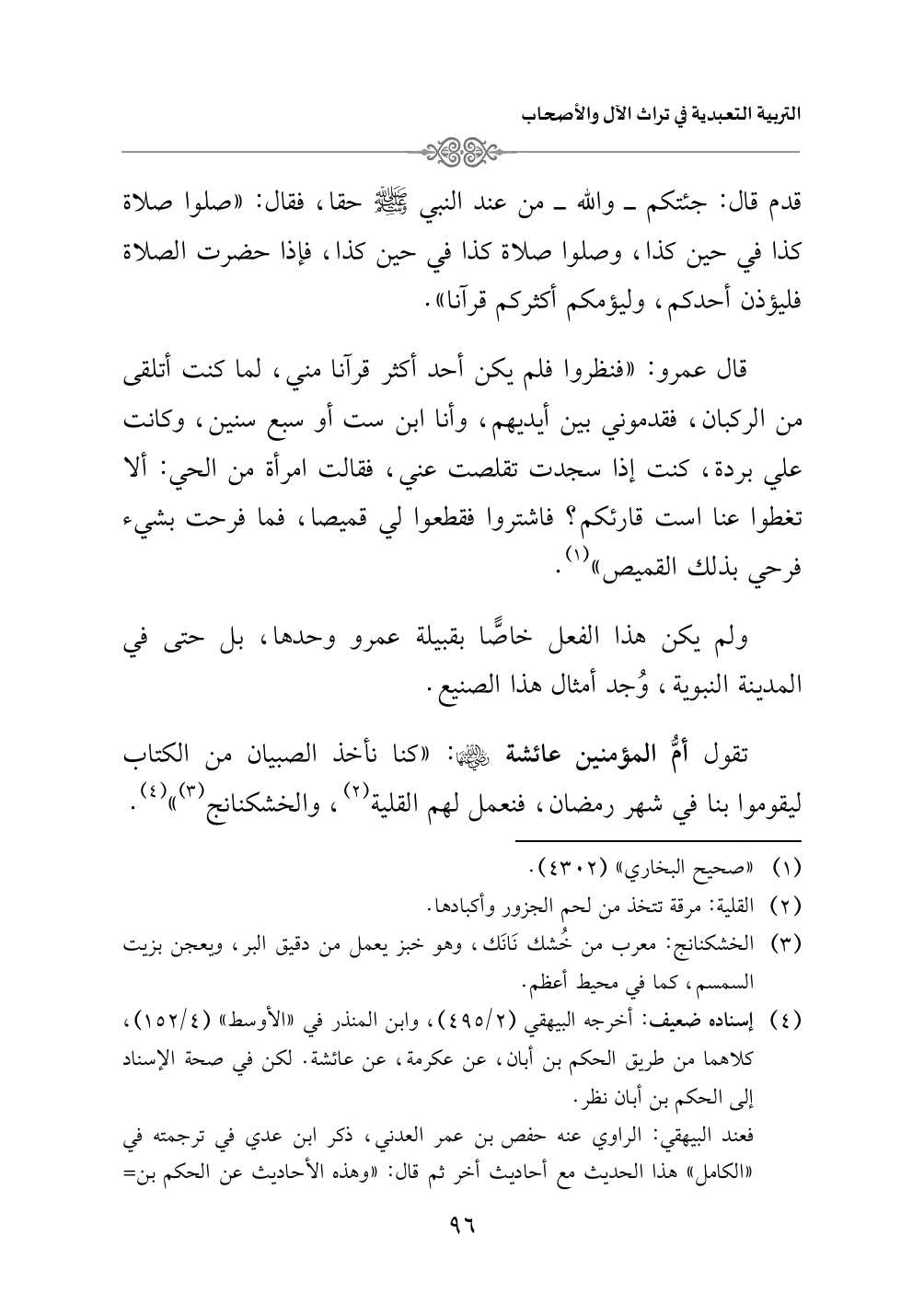 تقول أمُّ المؤمنين عائشة رضي الله عنها: «كنا نأخذ الصبيان من الكتاب ليقوموا بنا في شهر رمضان, فنعمل لهم القلية (¬٢) , والخشكنانج (¬٣)» (¬٤).