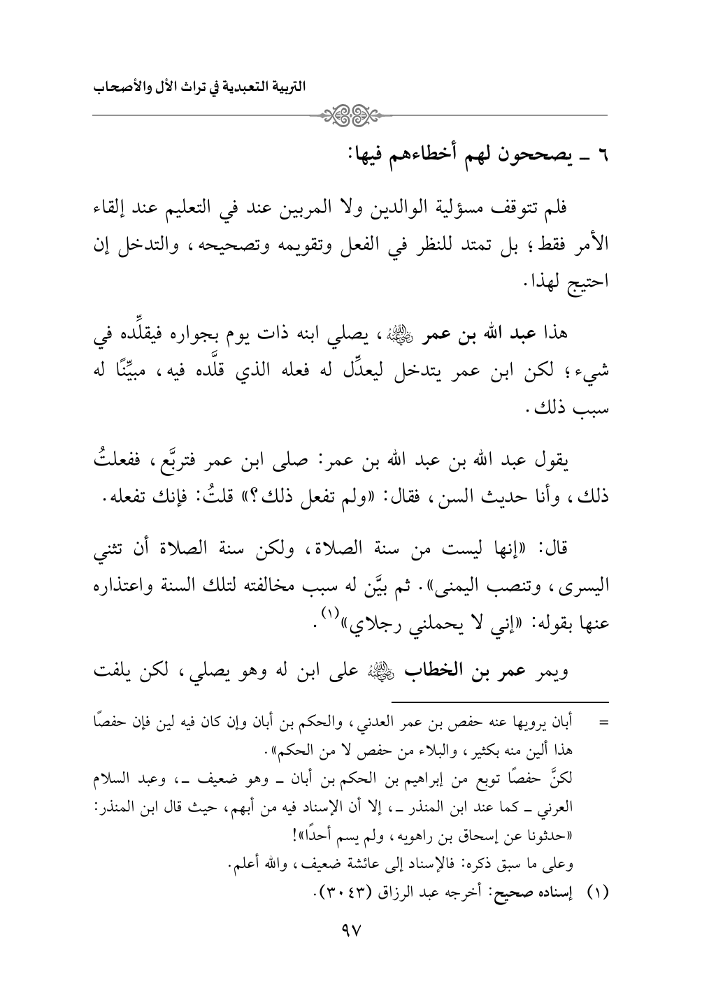 هذا عبدالله بن عمر - رضي الله عنه -، يصلي ابنه ذات يوم بجواره فيقلِّده في شيء؛ لكن ابن عمر يتدخل ليعدِّل له فعله الذي قلَّده فيه، مبيِّنًا له سبب ذلك.