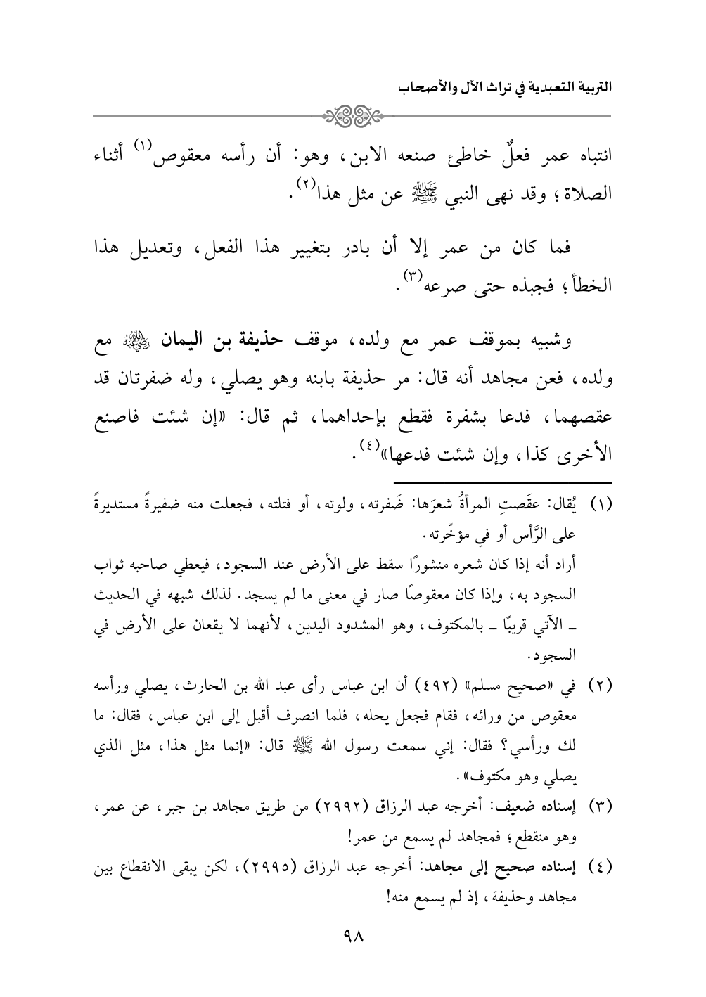 وشبيه بموقف عمر مع ولده، موقف حذيفة بن اليمان - رضي الله عنه - مع ولده، فعن مجاهد أنه قال: مر حذيفة بابنه وهو يصلي، وله ضفرتان قد عقصهما، فدعا بشفرة فقطع بإحداهما، ثم قال: «إن شئت فاصنع الأخرى كذا، وإن شئت فدعها» (¬٤).