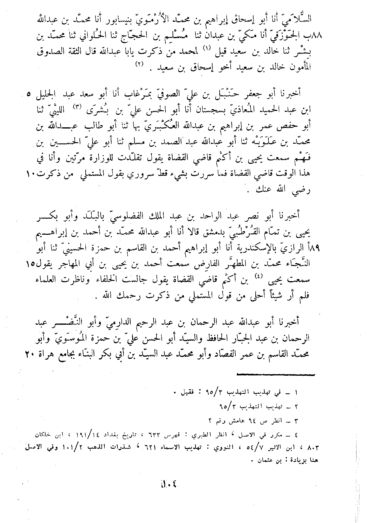 أَخْبَرَنَا أَبُو جَعْفَرٍ حَنْبَلُ بْنُ عَلِيٍّ الصُّوفِيُّ بِمِرْغَابَ أَنا أَبُو سَعْدٍ عَبْدُ الْجَلِيلِ بْنُ عَبْدِ الْحَمِيدِ الْمُعَاذِيُّ بِسِجِسْتَانَ أَنا أَبُو الْحَسَنِ عَلِيُّ بْنُ بُشْرَى اللَّيْثِيُّ ثَنَا أَبُو حَفْصٍ عُمَرُ بْنُ إِبْرَاهِيمَ بْنِ عَبْدِ اللَّهِ الْعَكْبَرِيُّ بِهَا ثَنَا أَبُو طَالِبٍ عَبْدُ اللَّهِ بْنُ مُحَمَّدِ بْنِ عَلَوَيْهِ ثَنَا أَبُو عَبْدِ اللَّهِ عَبْدُ الصَّمَدِ بْنُ مُسْلِمٍ ثَنَا أَبُو عَلِيٍّ الْحُسَيْنُ بْنُ فَهْمٍ سَمِعْتُ يَحْيَى بْنَ أَكْثَمَ قَاضِي الْقُضَاةِ يَقُولُ تَقَلَّدْتُ لِلْوَزَارَةِ مَرَّتَيْنِ وَأَنَا فِي هَذَا الْوَقْتِ قَاضِي الْقُضَاةِ فَمَا سُرِرْتُ بِشَيْءٍ قَطْ سُرُورِي بِقَوْلِ الْمُسْتَمْلِي مَنْ ذَكَرْتَ رَضِيَ اللَّهُ عَنْكَ
