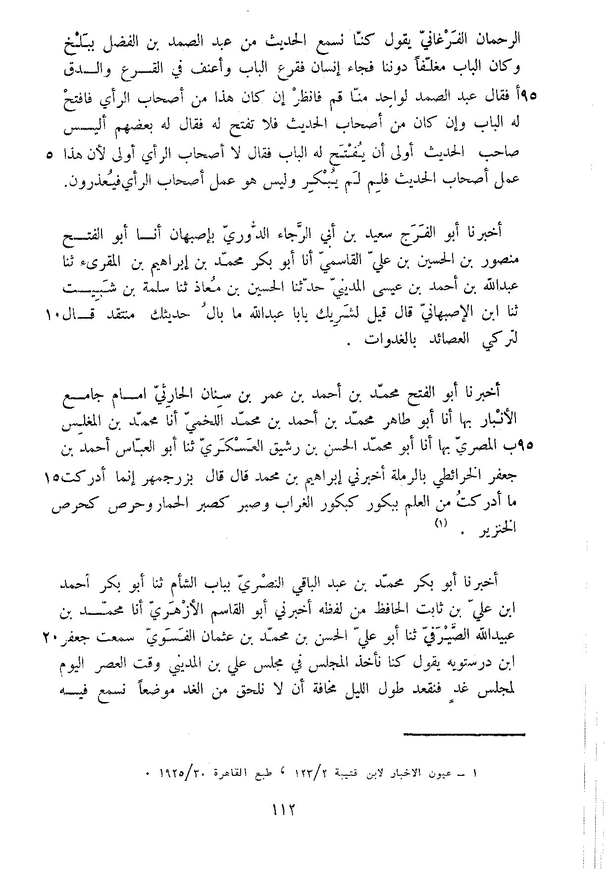 أَخْبَرَنَا أَبُو بَكْرٍ مُحَمَّدُ بْنُ عَبْدِ الْبَاقِي النَّصْرِيُّ بِبَابِ الشَّامِ ثناأبو بَكْرٍ أَحْمَدُ بْنُ عَلِيِّ بْنِ ثَابِتٍ الْحَافِظُ مِنْ لَفْظِهِ أَخْبَرَنِي أَبُو الْقَاسِمِ الأَزْهَرِيُّ أَنا مُحَمَّدُ بن عبيد الله الصَّيْرَفِي ثناأبو عَلِيٍّ الْحَسَنُ بْنُ مُحَمَّدِ بْنِ عُثْمَانَ الْفَسَوِيُّ سَمِعْتُ جَعْفَرَ بْنَ دَرَسْتَوَيْهِ يَقُولُ كُنَّا نَأْخُذُ الْمَجْلِسَ فِي مَجْلِسِ عَلِيِّ بْنِ الْمَدِينِيِّ وَقْتَ الْعَصْرَ الْيَوْمَ لِمَجْلِسِ غَدٍ فَنَقْعُدُ طُولَ اللَّيْلِ مَخَافَةَ أَنْ لَا نَلْحَقَ مِنَ الْغَدِ مَوْضِعًا نَسْمَعُ فِيهِ وَرَأَيْتُ شَيْخًا فِي الْمَجْلِسِ يَبُولُ فِي طَيْلَسَانِهِ وَيُدْرِجُ الطَّيْلَسَانَ حَتَّى فَرَغَ مَخَافَةَ أَنْ يُؤْخَذَ مَكَانُهُ إِنْ قَامَ لِلْبَوْلِ
