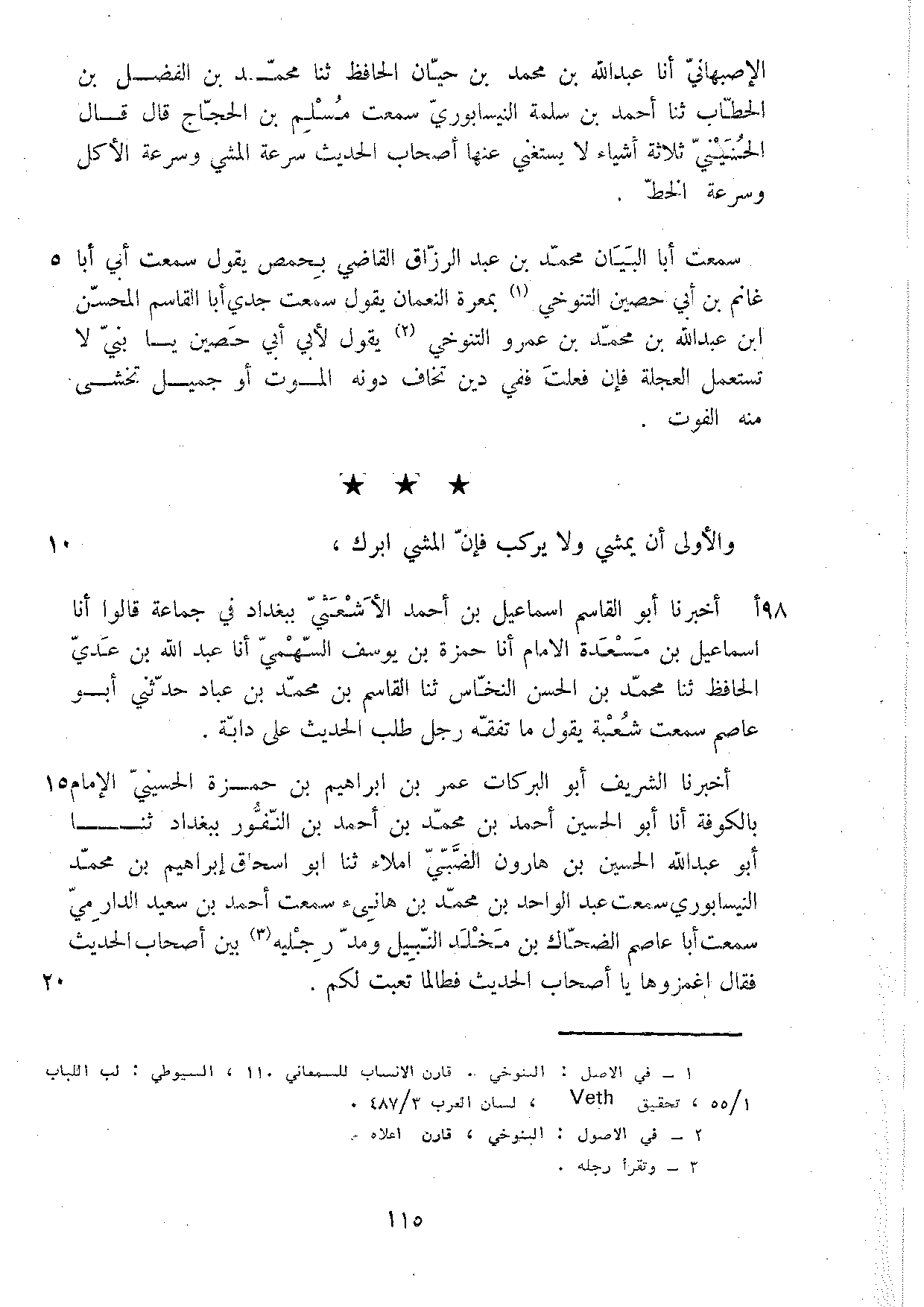 سَمِعْتُ أَبَا الْبَيَانِ مُحَمَّدَ بْنَ عَبْدِ الرَّزَّاقِ الْقَاضِي بِحِمْصَ يَقُولُ سَمِعْتُ أَبِي أَبَا غَانِمِ بْنِ أَبِي حُصَيْنٍ التَّنُوخِيُّ بِمَعَرَّةِ النُّعْمَانِ يَقُولُ سَمِعْتُ جَدِّي أَبَا الْقَاسِمِ الْمُحَسِّنَ بْنَ عَبْدِ اللَّهِ بْنِ مُحَمَّدِ بْنِ عَمْرٍو التَّنُوخِيُّ يَقُولُ لأَبِي أَبِي حُصَيْنٍ يَا بُنَيَّ لَا تَسْتَعْمِلِ الْعَجَلَةَ فَإِنْ فَعَلْتَ فَفِي دِينٍ تَخَافُ دُونَهُ الْمَوْتَ أَوْ جَمِيلٍ تَخْشَى مِنْهُ الْفَوْتَ وَالأَوْلَى أَنْ يَمْشِي وَلا يَرْكَبُ فَإِنَّ الْمَشْيَ أَبْرَكُ