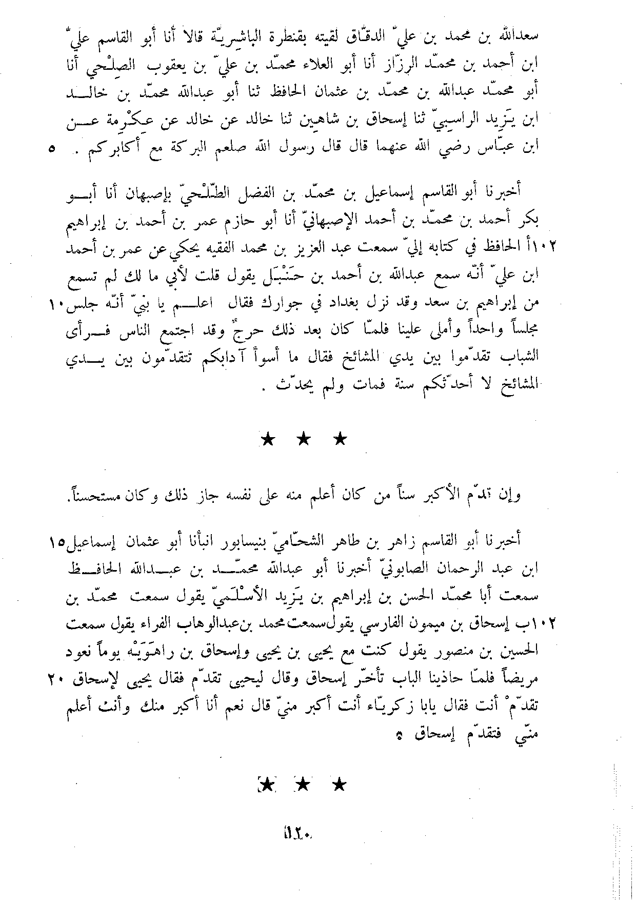 وَأَبُو الْحَسَنِ سَعْدُ اللَّهِ بْنُ مُحَمَّدِ بْنِ عَلِيٍّ الدَّقَّاقُ لَقِيتُهُ بِقَنْطَرَةِ الْبَاشرِيَّةِ قَالَا أَنا أَبُو الْقَاسِمِ عَلِيُّ بْنُ أَحْمَدَ بْنِ مُحَمَّدٍ الرَّزَّازُ أَنا أَبُو الْعَلاءِ مُحَمَّدُ بْنُ عَلِيِّ بْنِ يَعْقُوبَ الصِّلْحِيُّ أَنا أَبُو مُحَمَّدٍ عَبْدُ اللَّهِ بْنُ مُحَمَّدِ بْنِ عُثْمَانَ الْحَافِظُ ثَنَا أَبُو عَبْدِ اللَّهِ مُحَمَّدُ بْنُ خَالِدِ بْنِ يَزِيدَ الرَّاسِبِيُّ ثَنَا إِسْحَاقُ بْنُ شَاهِينَ ثَنَا خَالِدٌ عَنْ خَالِدٍ عَنْ عِكْرِمَة عَن بن عَبَّاسٍ رَضِيَ اللَّهُ عَنْهُمَا قَالَ قَالَ رَسُولُ اللَّهِ صَلَّى اللَّهُ عَلَيْهِ وَسَلَّمَ الْبَرَكَةُ مَعَ أَكَابِرِكُمْ أَخْبَرَنَا أَبُو الْقَاسِمِ إِسْمَاعِيلُ بْنُ مُحَمَّدِ بْنِ الْفَضْلِ الطَّلْحِيُّ بِأَصْبَهَانَ أَنا أَبُو بَكْرٍ أَحْمَدُ بْنُ مُحَمَّدِ بْنِ أَحْمَدَ الأَصْبَهَانِيُّ أَنا أَبُو حَازِمٍ عُمَرُ بْنُ أَحْمَدَ بْنِ إِبْرَاهِيمَ الْحَافِظُ فِي كِتَابِهِ إِلَيَّ سَمِعْتُ عَبْدَ الْعَزِيزِ بْنَ مُحَمَّدٍ الْفَقِيهَ يَحْكِي عَنْ عُمَرَ بْنِ أَحْمَدَ بْنِ عَلِيٍّ أَنَّهُ سَمِعَ عَبْدَ اللَّهِ بْنَ أَحْمَدَ بْنِ حَنْبَلٍ يَقُولُ قُلْتُ لأَبِي مَا لَكَ لَمْ تَسْمَعْ مِنْ إِبْرَاهِيمَ بْنِ سَعْدٍ وَقَدْ نَزَلَ بَغْدَادَ فِي جِوَارِكَ فَقَالَ أَعْلَمْ يَا بُنَيَّ أَنَّهُ جَلَسَ مَجْلِسًا وَاحِدًا وَأَمْلَى عَلَيْنَا فَلَمَّا كَانَ بعد ذَلِك حرج وَقَدِ اجْتَمَعَ النَّاسُ فَرَأَى الشَّبَابَ تَقَدَّمُوا بَيْنَ يَدَيِ الْمَشَائِخِ فَقَالَ مَا أَسْوَأَ آدَابِكُمْ تَتَقَدَّمُونَ بَيْنَ يَدَيِ الْمَشَائِخِ لَا أُحَدِّثُكُمْ سَنَةً فَمَاتَ وَلَمْ يُحَدِّثْ وَإِنْ قَدَّمَ الأَكْبَرُ سِنًّا مَنْ كَانَ أَعْلَمُ مِنْهُ عَلَى نَفْسِهِ جَازَ ذَلِكَ وَكَانَ مُسْتَحْسَنًا