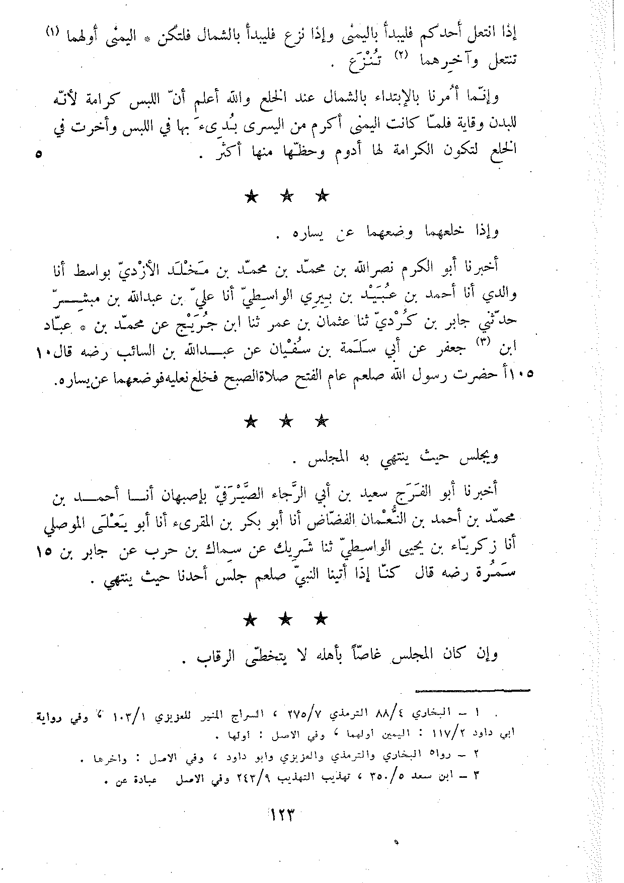 إِذَا انْتَعَلَ أَحَدُكُمْ فَلْيَبْدَأْ بِالْيُمْنَى وَإِذَا نَزَعَ فَلْيَبْدَأْ بِالشِّمَالِ فَلْتَكُنِ الْيُمْنَى أَوَّلُهُمَا تَنْتَعِلُ وَآخِرُهُمَا تَنْزَعُ وَإِنَّمَا أُمِرْنَا بِالابْتِدَاءِ بِالشَّمَالِ عِنْدَ الْخَلْعِ وَاللَّهُ أَعْلَمُ أَنَّ اللِّبْسَ كَرَامَةٌ لأَنَّهُ لِلْبَدَنِ وِقَايَةٌ فَلَمَّا كَانَتِ الْيُمْنَى أَكْرَمُ مِنَ الْيُسْرَى بدىء بِهَا فِي اللِّبْسِ وَأُخِّرَتْ فِي الْخَلْعِ لِتَكُونَ الْكَرَامَةُ لَهَا أَدْوَمُ وَحَظُّهَا مِنْهَا أَكْثَرُ وَإِذَا خَلَعَهُمَا وَضَعَهُمَا عَنْ يَسَارِهِ أَخْبَرَنَا أَبُو الْكَرَمِ نَصْرُ اللَّهِ بْنُ مُحَمَّدِ بْنِ مُحَمَّدِ بْنِ مَخْلَدٍ الأَزْدِيُّ بِوَاسِطٍ أَنا وَالِدِي أَنا أَحْمَدُ بْنُ عُبَيْدِ بْنِ بِيرِي الْوَاسِطِيُّ أَنا عَلِيُّ بْنُ عَبْدِ اللَّهِ بْنِ مُبَشِّرٍ حَدَّثَنِي جَابِرُ بْنُ كُرْدِي ثَنَا عُثْمَانُ بْنُ عُمَرَ ثَنَا بن جُرَيْجٍ عَنْ مُحَمَّدِ بْنِ عَبَّادِ بْنِ جَعْفَرٍ عَنْ أَبِي سَلَمَةَ بْنِ سُفْيَانَ عَنْ عَبْدِ اللَّهِ بن السَّائِب رضه قَالَ حَضَرَتْ رَسُولَ اللَّهِ صَلَّى اللَّهُ عَلَيْهِ وَسَلَّمَ عَامَ الْفَتْحِ صَلاةُ الصُّبْحِ فَخَلَعَ نَعْلَيْهِ فَوَضَعَهُمَا عَنْ يَسَارِهِ وَيَجْلِسُ حَيْثُ يَنْتَهِي بِهِ الْمَجْلِسُ أَخْبَرَنَا أَبُو الْفَرَجِ سَعِيدُ بْنُ أَبِي الرَّجَاءِ الصَّيْرَفِيُّ بِأَصْبَهَانَ أَنا أَحْمَدُ بْنُ مُحَمَّدِ بْنِ أَحْمَدَ بْنِ النُّعْمَانِ الْفَضَّاضُ أناأبو بكر بن المقرىء أَنا أَبُو يَعْلَى الْمَوْصِلِيُّ أَنا زَكَرِيَّا بْنُ يَحْيَى الْوَاسِطِيُّ ثَنَا شَرِيكٌ عَنْ سِمَاكِ بْنِ حَرْبٍ عَن جَابر بن سَمُرَة رضه قَالَ كُنَّا إِذَا أَتَيْنَا النَّبِيَّ صَلَّى اللَّهُ عَلَيْهِ وَسَلَّمَ جَلَسَ أَحَدُنَا حَيْثُ يَنْتَهِي وَإِنْ كَانَ الْمَجْلِسُ غَاصًّا بِأَهْلِهِ لَا يَتَخَطَّى الرِّقَابَ