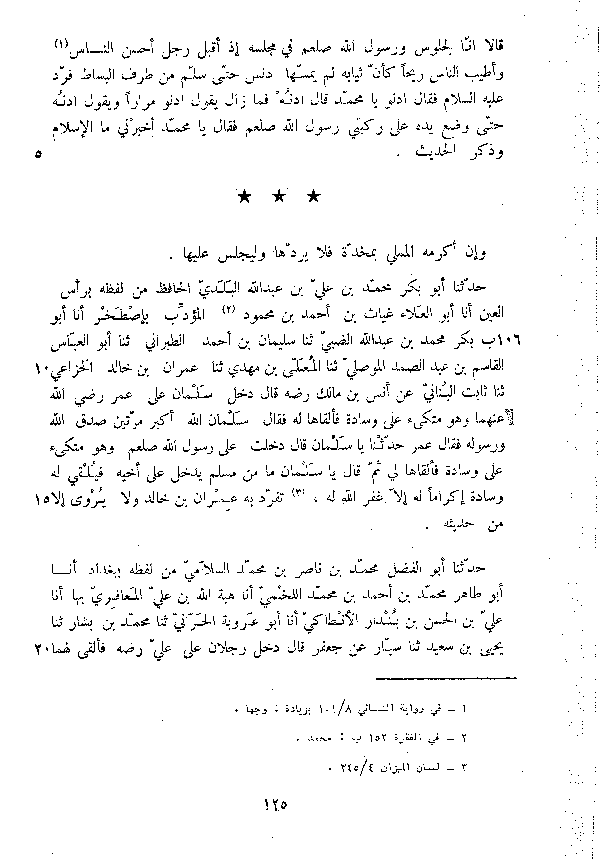 قَالَا إِنَّا لَجُلُوسٌ وَرَسُولُ اللَّهِ صَلَّى اللَّهُ عَلَيْهِ وَسَلَّمَ فِي مَجْلِسِهِ إِذْ أَقْبَلَ رَجُلٌ أَحْسَنُ النَّاسِ وَأَطْيَبُ النَّاِس رِيحًا كَأَنَّ ثِيَابَهُ لَمْ يَمَسَّهَا دَنَسٌ حَتَّى سَلَّمَ مِنْ طَرْفِ الْبِسَاطِ فَرَدَّ عَلَيْهِ السُّلامُ فَقَالَ أَدْنُو يَا مُحَمَّدُ قَالَ ادْنُهْ فَمَا زَالَ يَقُولُ أَدْنُو مِرَارًا وَيَقُولُ ادْنُهْ حَتَّى وَضَعَ يَدَهُ عَلَى رُكْبَتَيْ رَسُولُ اللَّهِ صَلَّى اللَّهُ عَلَيْهِ وَسَلَّمَ فَقَالَ يَا مُحَمَّدُ أَخْبِرْنِي مَا الإِسْلامُ وَذَكَرَ الْحَدِيثَ وَإِنْ أَكْرَمَهُ الْمُمَلِّي بِمَخَدَّةٍ فَلا يَرُدَّهَا وَلْيَجْلِسْ عَلَيْهَا حَدَّثَنَا أَبُو بَكْرٍ مُحَمَّدُ بْنُ عَلِيِّ بْنِ عَبْدِ الله الْحَافِظُ مِنْ لَفْظِهِ بِرَأْسِ الْعَيْنِ أَنا أَبُو الْعَلاءِ غِيَاثُ بْنُ أَحْمَدَ بْنِ مَحْمُودٍ الْمُؤَدِّبُ بِإِصْطَخْرَ أَنا أَبُو بَكْرٍ مُحَمَّدُ بْنُ عَبْدِ اللَّهِ الضَّبِّيُّ ثَنَا سُلَيْمَانُ بْنُ أَحْمَدَ الطَّبَرَانِيُّ ثَنَا أَبُو الْعَبَّاسِ الْقَاسِمُ بْنُ عَبْدِ الصَّمَدِ الْمُوصِلِيُّ ثَنَا الْمُعَلَّى بْنُ مَهْدِيٍّ ثَنَا عِمْرَانُ بْنُ خَالِدٍ الْخُزَاعِيُّ ثَنَا ثَابِتٌ الْبُنَانِيُّ عَنْ أَنَسِ بن مَالك رضه قَالَ دَخَلَ سَلْمَانُ عَلَى عُمَرَ رَضِيَ اللَّهُ عَنْهُمَا وَهُوَ مُتَّكِئٌ عَلَى وِسَادَةٍ فَأَلْقَاهَا لَهُ فَقَالَ سَلْمَانُ اللَّهُ أَكْبَرُ مَرَّتَيْنِ صَدَقَ اللَّهُ وَرَسُوُلُهُ فَقَالَ عُمَرُ حَدِّثْنَا يَا سُلَيْمَان قَالَ دَخَلْتُ عَلَى رَسُولِ اللَّهِ صَلَّى اللَّهُ عَلَيْهِ وَسَلَّمَ وَهُوَ مُتَّكِئٌ عَلَى وِسَادَةٍ فَأَلْقَاهَا لِي ثُمَّ قَالَ يَا سَلْمَانُ مَا مِنْ مُسْلِمٍ يَدْخُلُ عَلَى أَخِيهِ فَيُلْقِي لَهُ وِسَادَةً إِكْرَامًا لَهُ إِلا غَفَرَ اللَّهُ لَهُ تَفَرَّدَ بِهِ عِمْرَانُ بْنُ خَالِدٍ وَلا يُرْوَى إِلا مِنْ حَدِيثِهِ حَدَّثَنَا أَبُو الْفَضْلِ مُحَمَّدُ بْنُ نَاصِرِ بْنِ مُحَمَّدٍ السَّلامِيُّ مِنْ لَفْظِهِ بِبَغْدَادَ أَنا أَبُو طَاهِرٍ مُحَمَّدُ بْنُ أَحْمَدَ بْنِ مُحَمَّدٍ اللَّخْمِيُّ أَنا هِبَةُ اللَّهِ بْنُ عَلِيٍّ الْمَعَافِرِيُّ بِهَا أَنا عَلِيُّ بْنُ الْحَسَنِ بْنِ بُنْدَارٍ الأَنْطَاكِيُّ أَنا أَبُو عَرُوبَةَ الْحَرَّانِيُّ ثَنَا مُحَمَّدُ بْنُ بَشَّارٍ ثَنَا يَحْيَى بْنُ سَعِيدٍ ثَنَا سَيَّارٌ عَنْ جَعْفَرٍ قَالَ دَخَلَ رَجُلانِ عَلَى عَلِيٍّ رضه فَأَلْقَى لَهُمَا