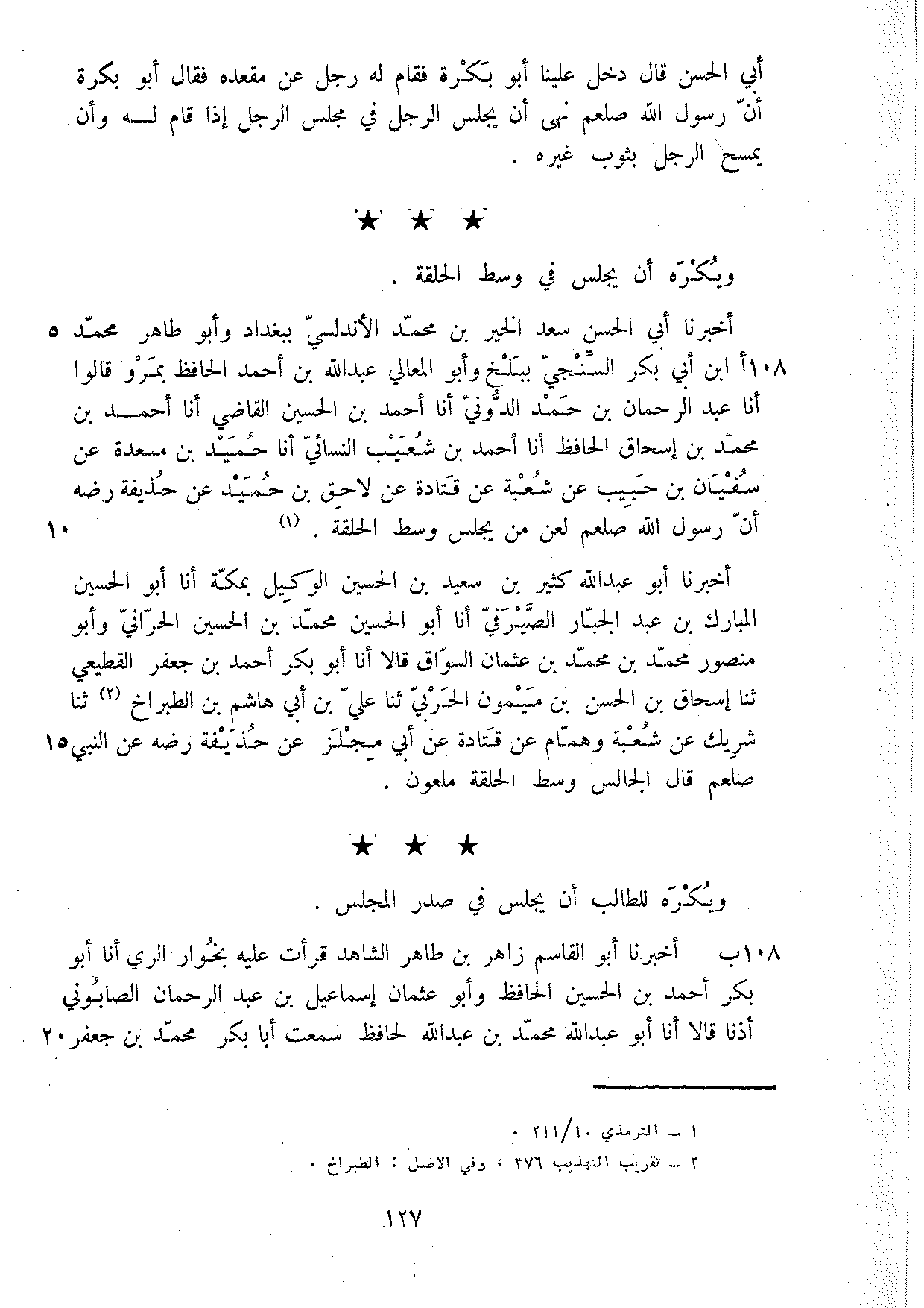 أَبِي الْحَسَنِ قَالَ دَخَلَ عَلَيْنَا أَبُو بَكْرَةَ فَقَامَ لَهُ رَجُلٌ عَنْ مَقْعَدِهِ فَقَالَ أَبُو بَكْرَةَ أَنَّ رَسُولَ اللَّهِ صَلَّى اللَّهُ عَلَيْهِ وَسَلَّمَ نَهَى أَنْ يَجْلِسَ الرَّجُلُ فِي مَجْلِسِ الرَّجُلِ إِذَا قَامَ لَهُ وَأَنْ يَمْسَحَ الرَّجُلُ بِثَوْبِ غَيْرِهِ وَيُكْرَهُ أَنْ يَجْلِسَ فِي وسط الْحلقَة أخبرناأبي الْحَسَنِ سَعْدُ الْخَيْرِ بْنُ مُحَمَّدِ الأَنْدَلُسِيُّ بِبَغْدَادَ وَأَبُو طَاهِرٍ مُحَمَّدُ بْنُ أَبِي بَكْرٍ السِّنْجِيُّ بِبَلْخٍ وَأَبُو الْمَعَالِي عَبْدُ اللَّهِ بْنُ أَحْمَدَ الْحَافِظُ بِمَرْوَ قَالُوا أَنا عَبْدُ الرَّحْمَنِ بْنُ حَمْدٍ الدُّونِيُّ أَنا أَحْمَدُ بْنُ الْحُسَيْنِ الْقَاضِي أَنا أَحْمَدُ بْنُ مُحَمَّدِ بْنِ إِسْحَاقَ الْحَافِظُ أَنا أَحْمَدُ بْنُ شُعَيْبٍ النَّسَائِيُّ أَنا حُمَيْدُ بْنُ مَسْعَدَةَ عَنْ سُفْيَانَ بْنِ حَبِيبٍ عَنْ شُعْبَةَ عَنْ قَتَادَةَ عَنْ لاحِقِ بْنِ حُمَيْدٍ عَنْ حُذَيْفَةَ رضه أَنَّ رَسُولَ اللَّهِ صَلَّى اللَّهُ عَلَيْهِ وَسَلَّمَ لعَنْ مَنْ يَجْلِسُ وَسَطَ الْحَلْقَةِ أَخْبَرَنَا أَبُو عَبْدِ اللَّهِ كَثِيرُ بْنُ سَعِيدِ بْنِ الْحُسَيْنِ الْوَكِيلُ بِمَكَّةَ أَنا أَبُو الْحُسَيْنِ الْمُبَارَكُ بْنُ عَبْدِ الْجَبَّارِ الصَّيْرَفِيُّ أَنا أَبُو الْحُسَيْنِ مُحَمَّدُ بْنُ الْحُسَيْنِ الْحَرَّانِيُّ وَأَبُو مَنْصُورٍ مُحَمَّدُ بْنُ مُحَمَّدِ بْنِ عُثْمَانَ السواق قَالَا أَنا أَبُو بَكْرٍ أَحْمَدُ بْنُ جَعْفَرٍ الْقَطِيعِيُّ ثَنَا إِسْحَاقُ بْنُ الْحَسَنِ بْنِ مَيْمُونٍ الْحَرْبِيُّ ثَنَا عَلِيُّ بْنُ أَبِي هَاشِمِ بْنِ الطَّبْرَاخِ ثَنَا شَرِيكٌ عَنْ شُعْبَةَ وَهَمَّامٍ عَنْ قَتَادَةَ عَنْ أبي مجلز عَن حُذَيْفَة رضه عَنِ النَّبِيِّ صَلَّى اللَّهُ عَلَيْهِ وَسَلَّمَ قَالَ الْجَالِسُ وَسَطَ الْحَلْقَةِ مَلْعُونٌ وَيُكْرَهُ لِلطَّالِبِ أَنْ يَجْلِسَ فِي صَدْرِ الْمَجْلِسِ أَخْبَرَنَا أَبُو الْقَاسِمِ زاهرُ بْنُ طَاهِرٍ الشَّاهِدُ عَلَيْهِ بخوار الرّيّ أناأبو بَكْرٍ أَحْمَدُ بْنُ الْحُسَيْنِ الْحَافِظُ وَأَبُو عُثْمَانَ إِسْمَاعِيلُ بْنُ عَبْدِ الرَّحْمَنِ الصَّابُونِيُّ إِذْنًا قَالَا أَنا أَبُو عَبْدِ اللَّهِ مُحَمَّدُ بْنُ عَبْدِ اللَّهِ الْحَافِظُ سَمِعْتُ أَبَا بَكْرٍ مُحَمَّدَ بْنَ جَعْفَرٍ