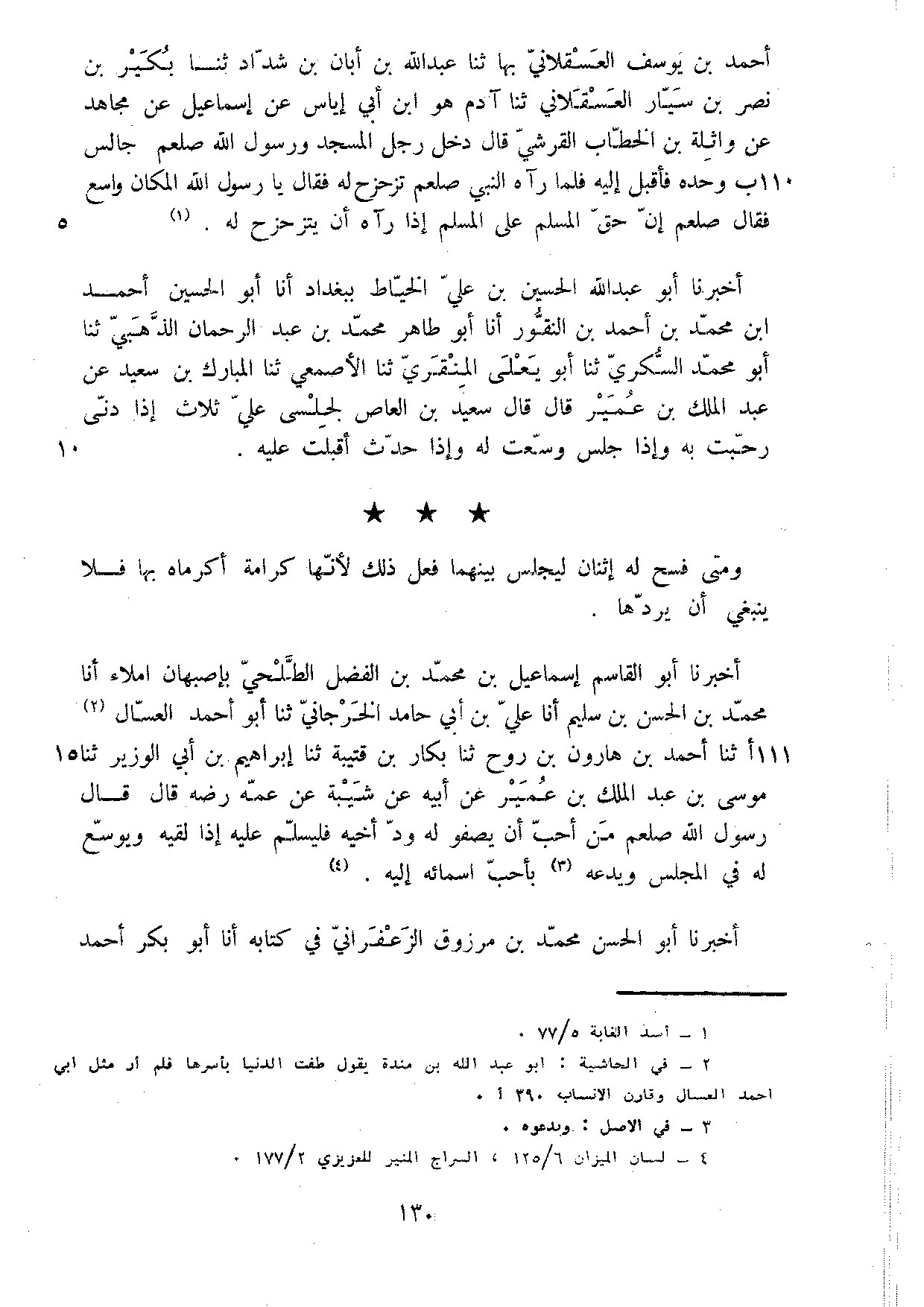 أَحْمَدَ بْنِ يُوسُفَ الْعَسْقَلانِيُّ بِهَا ثَنَا عَبْدُ اللَّهِ بْنُ أَبَانِ بْنِ شَدَّادٍ ثَنَا بُكَيْرُ بْنُ نَصْرِ بْنِ سَيَّارٍ الْعَسْقَلانِيُّ ثَنَا آدم هُوَ بن أَبِي إِيَاسٍ عَنْ إِسْمَاعِيلَ عَنْ مُجَاهِدٍ عَنْ وَاثِلَةَ بْنِ الْخَطَّابِ الْقُرَشِيُّ قَالَ دَخَلَ رَجُلٌ الْمَسْجِدَ وَرَسُولُ اللَّهِ صَلَّى اللَّهُ عَلَيْهِ وَسَلَّمَ جَالِسٌ وَحْدَهُ فَأَقْبَلَ إِلَيْهِ فَلَمَّا رَآهُ النَّبِيُّ صَلَّى اللَّهُ عَلَيْهِ وَسَلَّمَ تَزَحْزَحَ لَهُ فَقَالَ يَا رَسُولَ اللَّهِ الْمَكَانُ وَاسِعٌ فَقَالَ صَلَّى اللَّهُ عَلَيْهِ وَسَلَّمَ إِنَّ حَقَّ الْمُسْلِمِ عَلَى الْمُسْلِمِ إِذَا رَآهُ أَنْ يَتَزَحْزَحَ لَهُ أَخْبَرَنَا أَبُو عَبْدِ اللَّهِ الْحُسَيْنُ بْنُ عَلِيٍّ الْخَيَّاطُ بِبَغْدَادَ أَنا أَبُو الْحُسَيْنِ أَحْمَدُ بْنُ مُحَمَّدِ بن النقور أناأبو طَاهِرٍ مُحَمَّدُ بْنُ عَبْدِ الرَّحْمَنِ الذَّهَبِيُّ ثَنَا أَبُو مُحَمَّدٍ السِّكَّرِيُّ ثَنَا أَبُو يَعْلَى الْمِنْقَرِيُّ ثَنَا الأَصْمَعِيُّ ثَنَا الْمُبَارَكُ بْنُ سَعِيدٍ عَنْ عَبْدِ الْمَلِكِ بْنِ عُمَيْرٍ قَالَ قَالَ سَعِيدُ بْنُ الْعَاصِ لجلسي عَلَيَّ ثَلاثٌ إِذَا دَنَى رَحَّبْتُ بِهِ وَإِذَا جَلَسَ وَسَّعْتُ لَهُ وَإِذَا حَدَّثَ أَقْبَلْتُ عَلَيْهِ وَمَتَى فَسَّحَ لَهُ اثْنَانِ لِيَجْلِسَ بَيْنَهُمَا فَعَلَ ذَلِكَ لأَنَّهَا كَرَامَةٌ أَكْرَمَاهُ بِهَا فَلا يَنْبَغِي أَنْ يَرُدَّهَا أَخْبَرَنَا أَبُو الْقَاسِمِ إِسْمَاعِيلُ بْنُ مُحَمَّدِ بْنِ الْفَضْلِ الطَّلْحِيُّ بِأَصْبَهَانَ إِمْلاءً أَنا مُحَمَّدُ بْنُ الْحَسَنِ بْنِ سُلَيْمٍ أَنا عَلِيُّ بْنُ أَبِي حَامِدٍ الْخَرْجَانِيُّ ثَنَا أَبُو أَحْمَدَ الْعَسَّالُ ثَنَا أَحْمَدُ بْنُ هَارُونَ بْنِ رَوْحٍ ثَنَا بَكَّارُ بن قُتَيْبَة ثناإبراهيم بْنُ أَبِي الْوَزِيرِ ثَنَا مُوسَى بْنُ عَبْدِ الْمَلِكِ بْنِ عُمَيْرٍ عَنْ أَبِيهِ عَنْ شَيْبَةَ عَنْ عَمه رضه قَالَ قَالَ رَسُولُ اللَّهِ صَلَّى اللَّهُ عَلَيْهِ وَسَلَّمَ مَنْ أَحَبَّ أَنْ يَصْفُوَ لَهُ وُدُّ أَخِيهِ فَلْيُسَلِّمْ عَلَيْهِ إِذَا لَقِيَهُ وَيُوَسِّعُ لَهُ فِي الْمَجْلِسِ وَيَدْعُهُ بِأَحَبِّ أَسْمَائِهِ إِلَيْهِ أَخْبَرَنَا أَبُو الْحَسَنِ مُحَمَّدُ بْنُ مَرْزُوقٍ الزَّعْفَرَانِيُّ فِي كِتَابِهِ أَنا أَبُو بَكْرٍ أَحْمَدُ